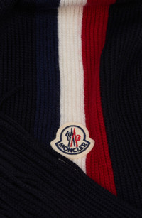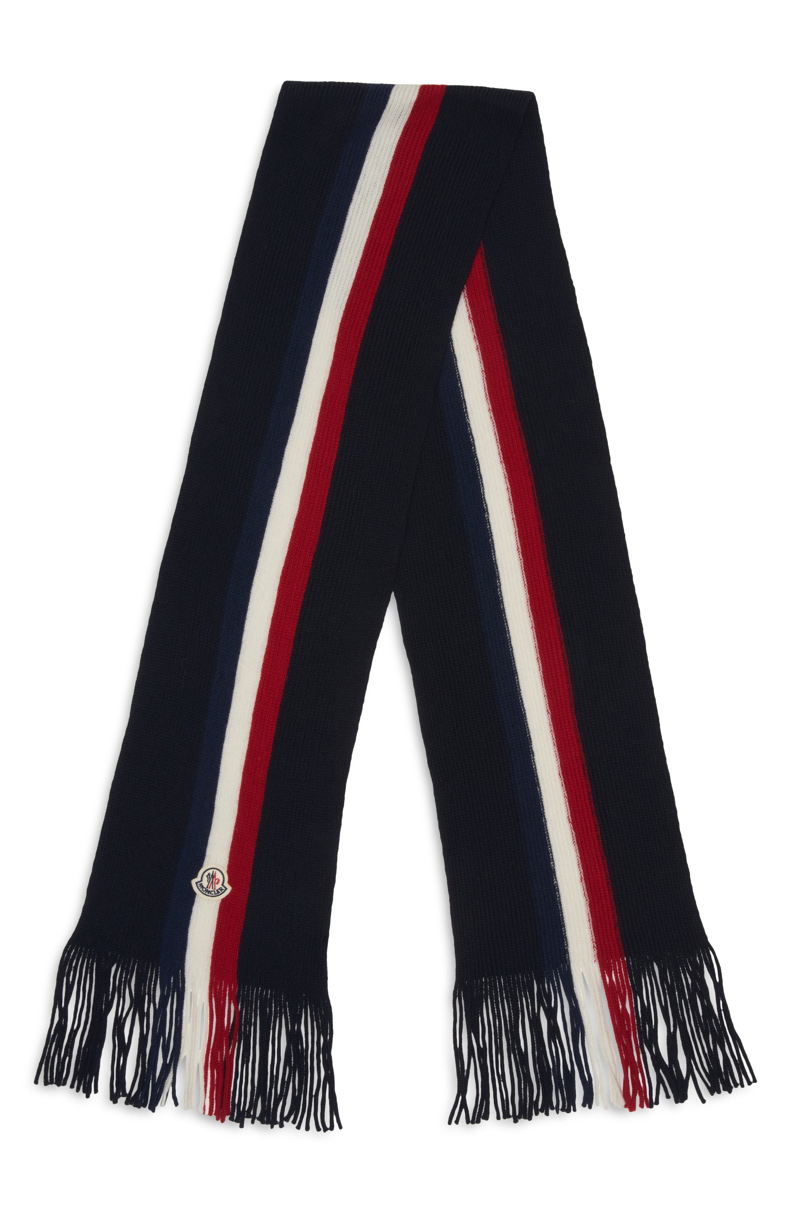 Moncler Logo Patch Stripe Virgin Wool Fringe Scarf in Navy Blue at Nordstrom