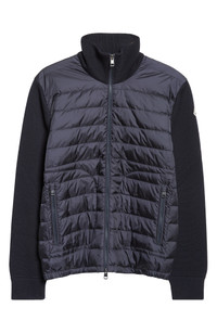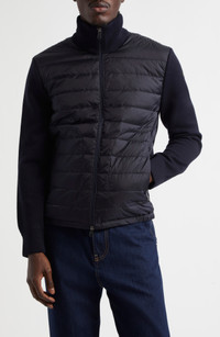 Part puffer, part cardigan, this hybrid style offers lightweight warmth via a combination of virgin-wool-blend knit sleeves and back with a down-filled quilted front. Two-way front-zip closure Stand collar Long sleeves with ribbed cuffs Front zip pockets Partially lined, with 90% down, 10% feather fill (Moldova) 100% nylon with 50% acrylic, 50% virgin wool contrast Dry clean Made in the Republic of Moldova Designer Clothing