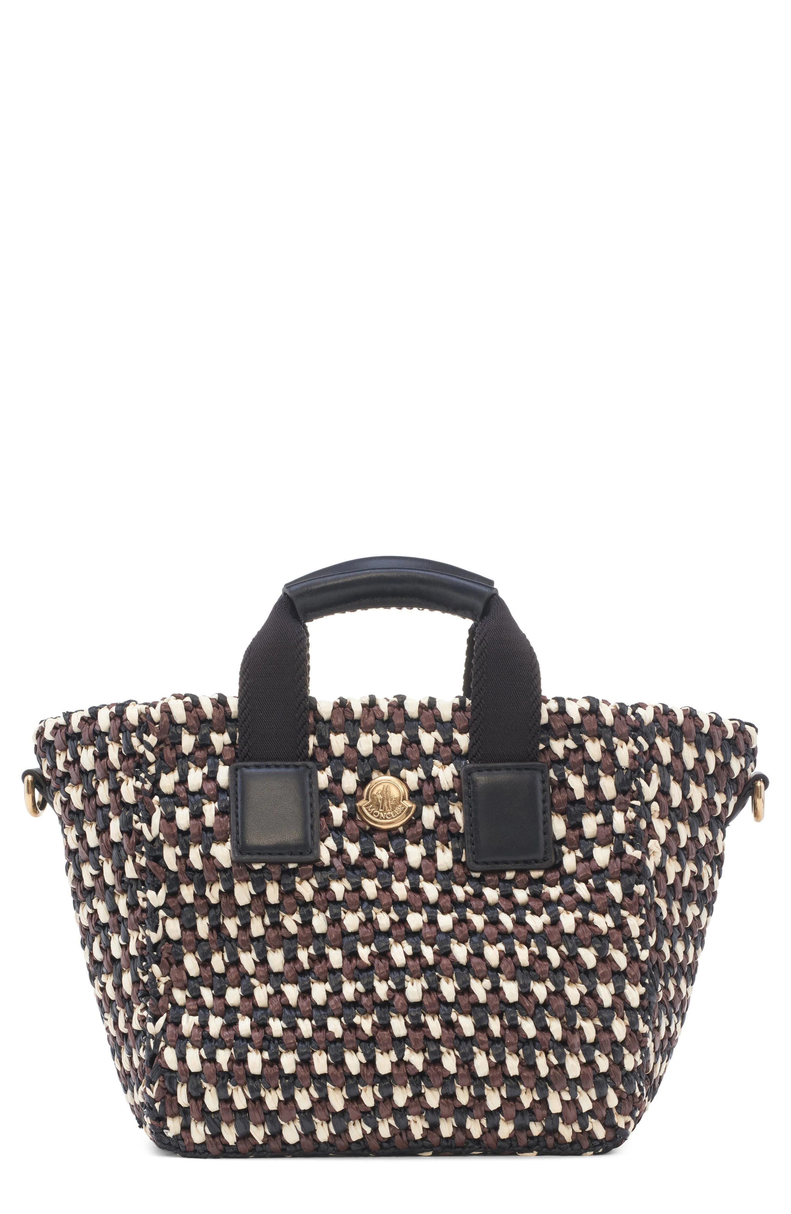 Raffia-like weaving brings seasonal texture and pattern to this mini crossbody bag fitted with webbing and leather top carry handles and a coordinating removable strap for versatility. Top zip closure Top carry handles; removable crossbody strap Structured silhouette with flat base for stability Cotton lining Textile/leather Imported Designer Handbags