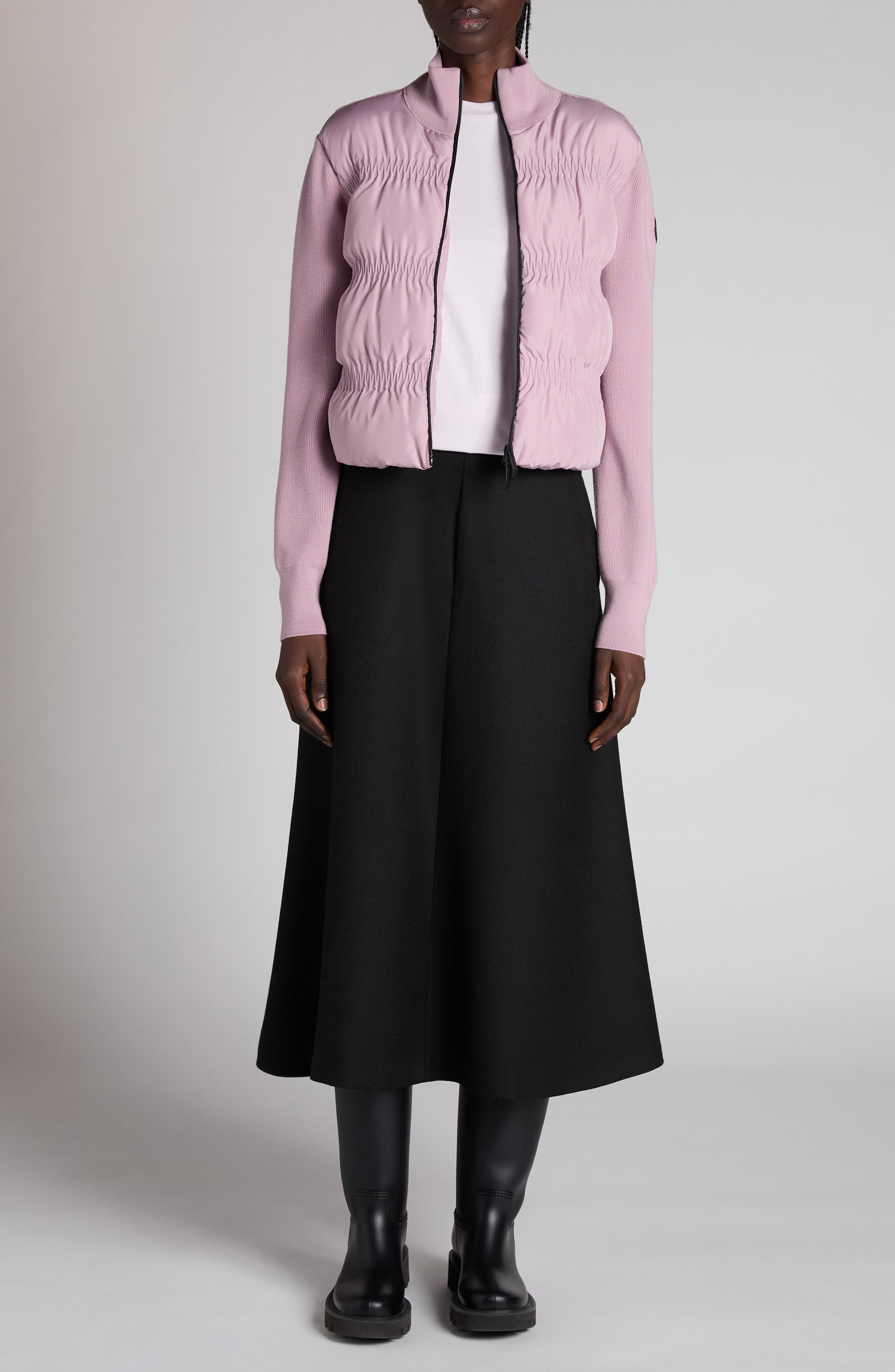 The haute-mountaineering label combines the soft comfort of a cardigan with the unparalleled warmth of a puffer with this mixed-media jacket featuring a down-insulated front contrasted by knit virgin wool at the sleeves and back. Two-way front-zip closure Stand collar Lined, with 90% down, 10% feather fill 100% polyester with 100% virgin wool contrast Dry clean Imported Designer Clothing