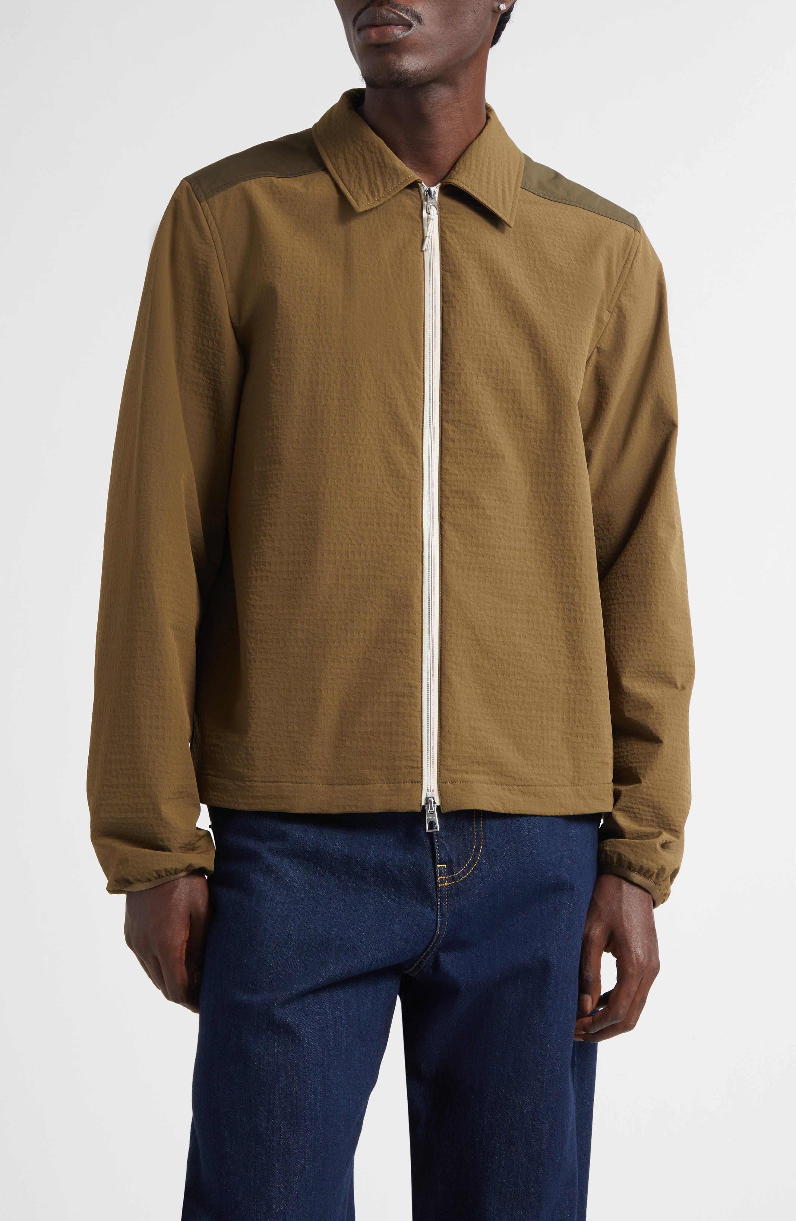A tactile twist on everyday outerwear, this zip-up shirt blends the crinkled charm of seersucker with sleek microfiber accents for a dynamic play on texture. Light padding and windproof pockets amp up its practicality to make it the perfect layering piece for milder days. Two-way front-zip closure Point collar Elastic cuffs Side-seam pockets Lined, with 100% polyester fill 85% nylon, 16% elastane with 100% polyester contrast Hand wash, dry flat Made in Romania Designer Clothing