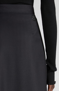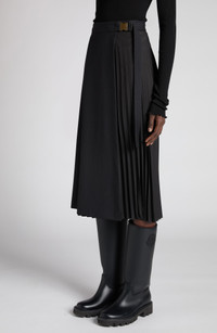 A squeeze-buckle belt lends utility-inspired style to this wool twill skirt designed in a swingy pleat-detailed wrap silhouette. True wrap style with side-buckle closure 100% wool Dry clean Imported Designer Clothing