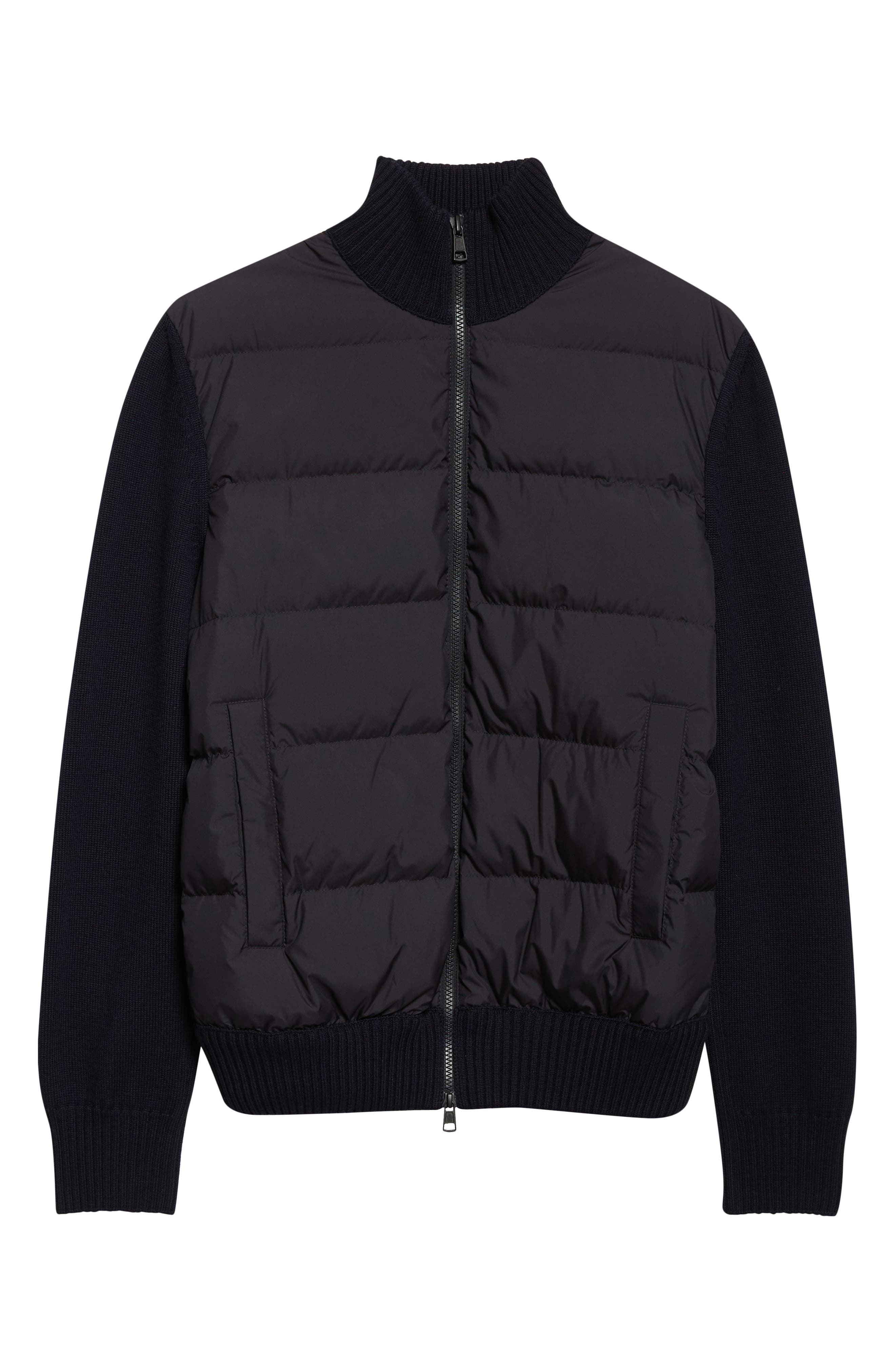 Part puffer, part cardigan, this hybrid style offers lightweight warmth via a combination of wool-knit sleeves and back with a down-filled quilted front. Perfect as outerwear in milder temps, it’s a transitional piece that works as hard as you do. Two-way front-zip closure Stand collar Front zip pockets Ribbed cuffs and hem Partially lined, with 90% down, 10% feather fill 100% virgin wool with 100% polyester contrast Dry clean Made in the Republic of Moldova Designer Clothing