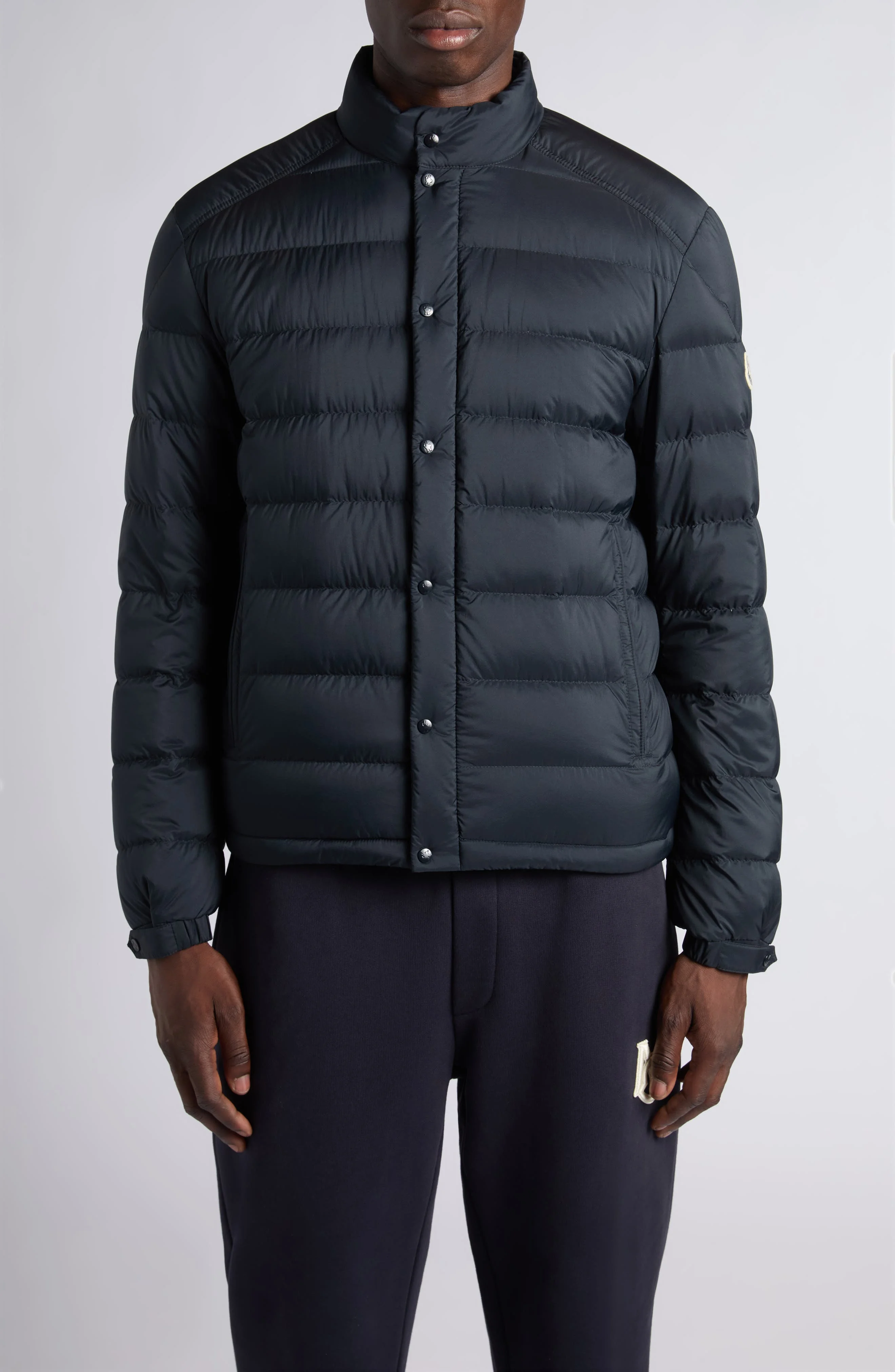 This water-repellent nylon puffer is perfect for the shoulder seasons with its lightweight fill, classic fit and adjustable snap-tab cuffs to keep out the damp. Front zip closure with snap storm placket Stand collar Elastic cuffs with adjustable snap tab Front zip-welt pockets Drawstring hem Water repellent Lined, with 100% polyester fill 100% nylon Dry clean Imported Designer Clothing