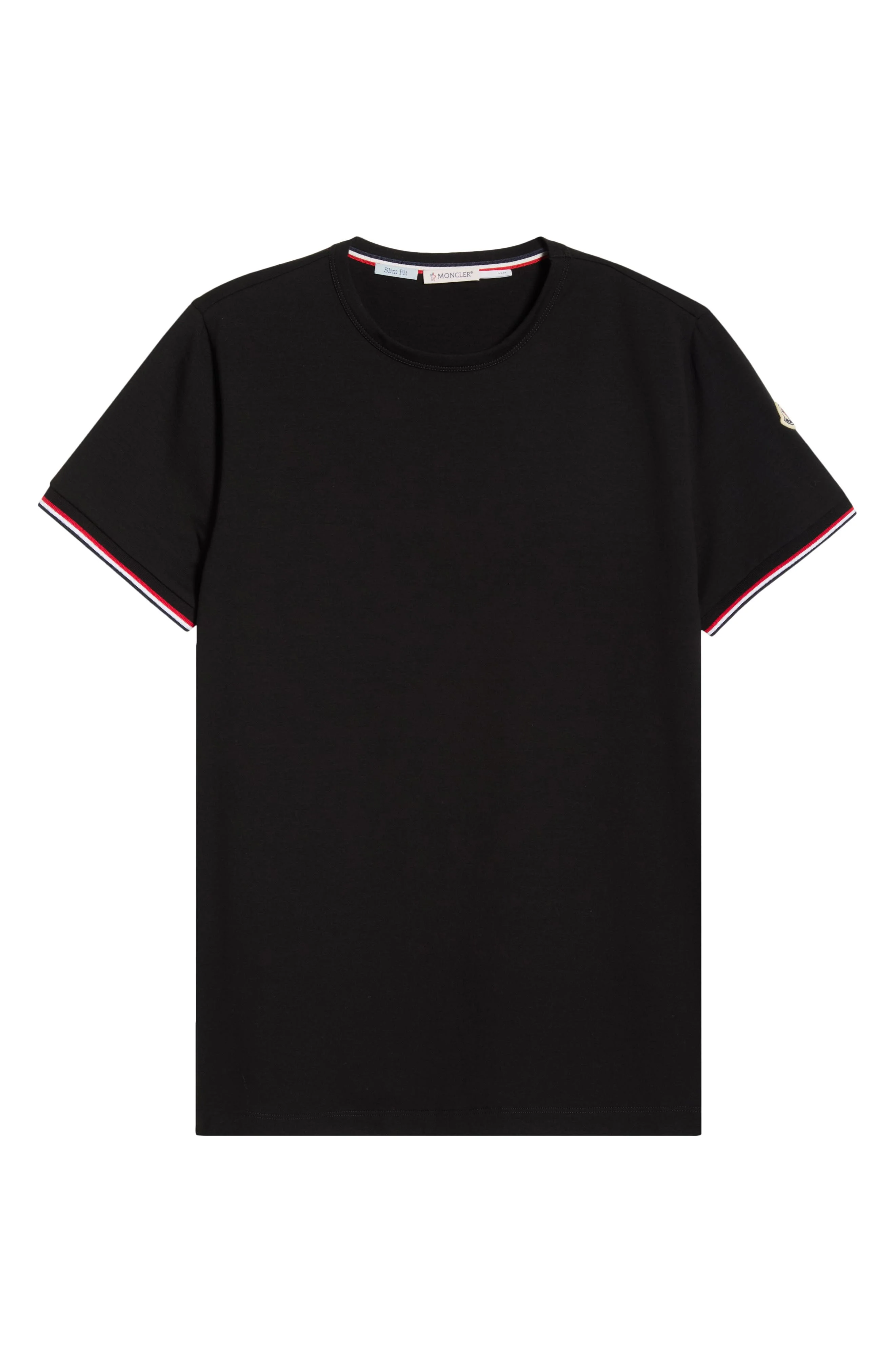 Classic tipping at the cuffs enhances the sporty look of this crewneck T-shirt detailed with Moncler's signature cockerel logo at one sleeve. Crewneck Short sleeves 92% cotton, 8% elastane Dry clean Imported Designer Clothing