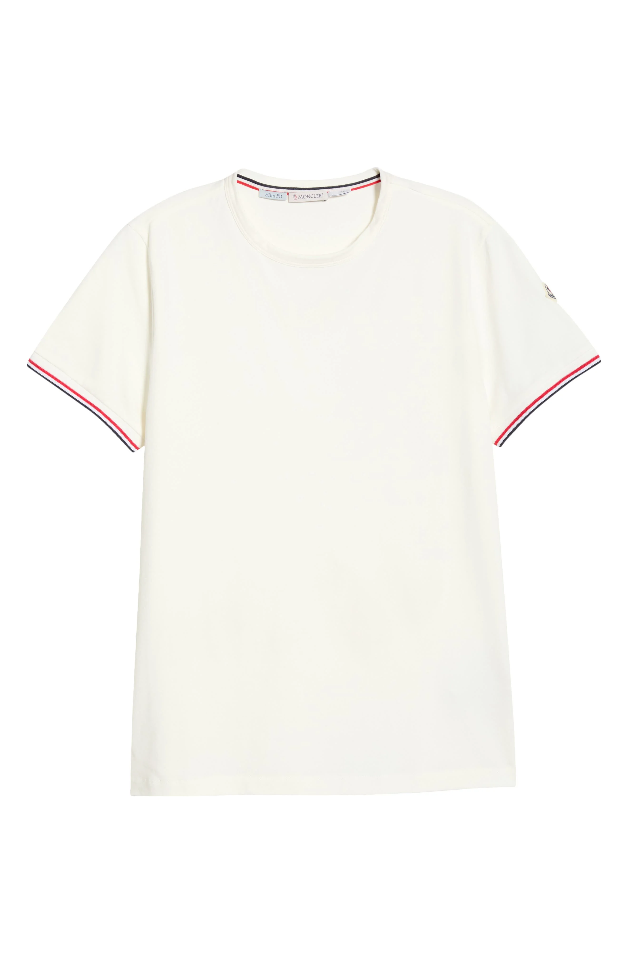 Classic tipping at the cuffs enhances the sporty look of this crewneck T-shirt detailed with Moncler's signature cockerel logo at one sleeve. Crewneck Short sleeves 92% cotton, 8% elastane Dry clean Imported Designer Clothing