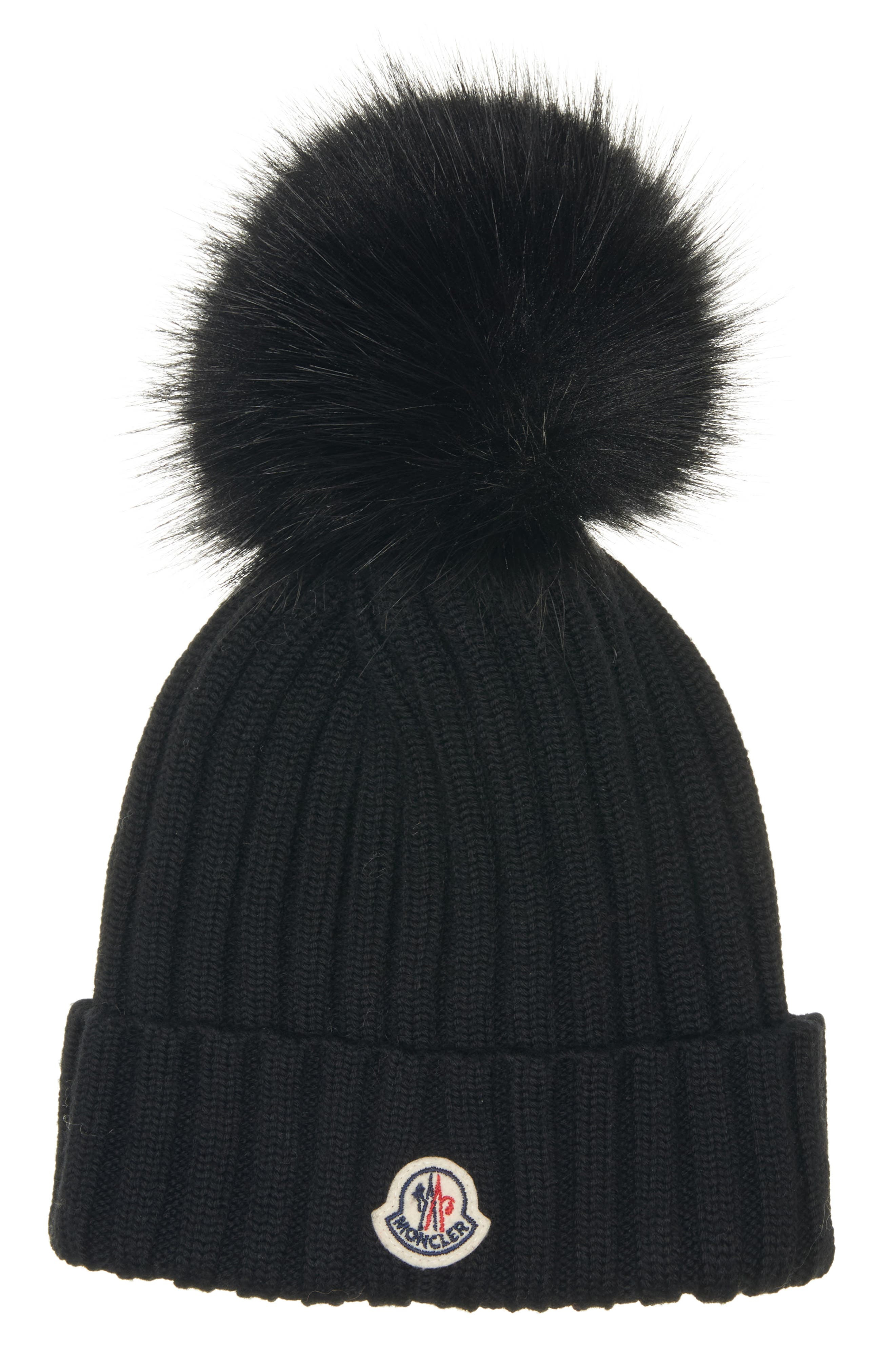 Moncler Virgin Wool Rib Beanie with Faux Fur Pompom in Black at Nordstrom