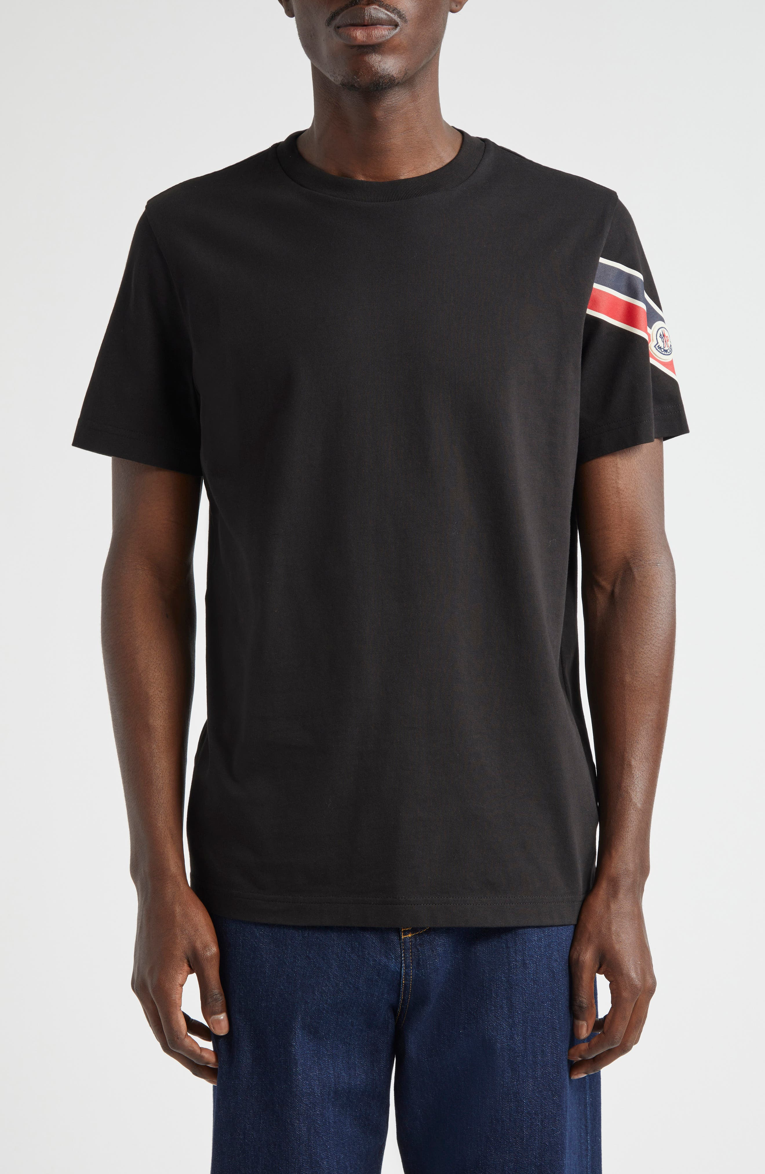 Stripes emblazoned on one sleeve bring the label's signature colors to a casual T-shirt fashioned from comfortable cotton. Crewneck Short sleeves Dropped shoulders 100% cotton Machine wash, line dry Imported Designer Clothing