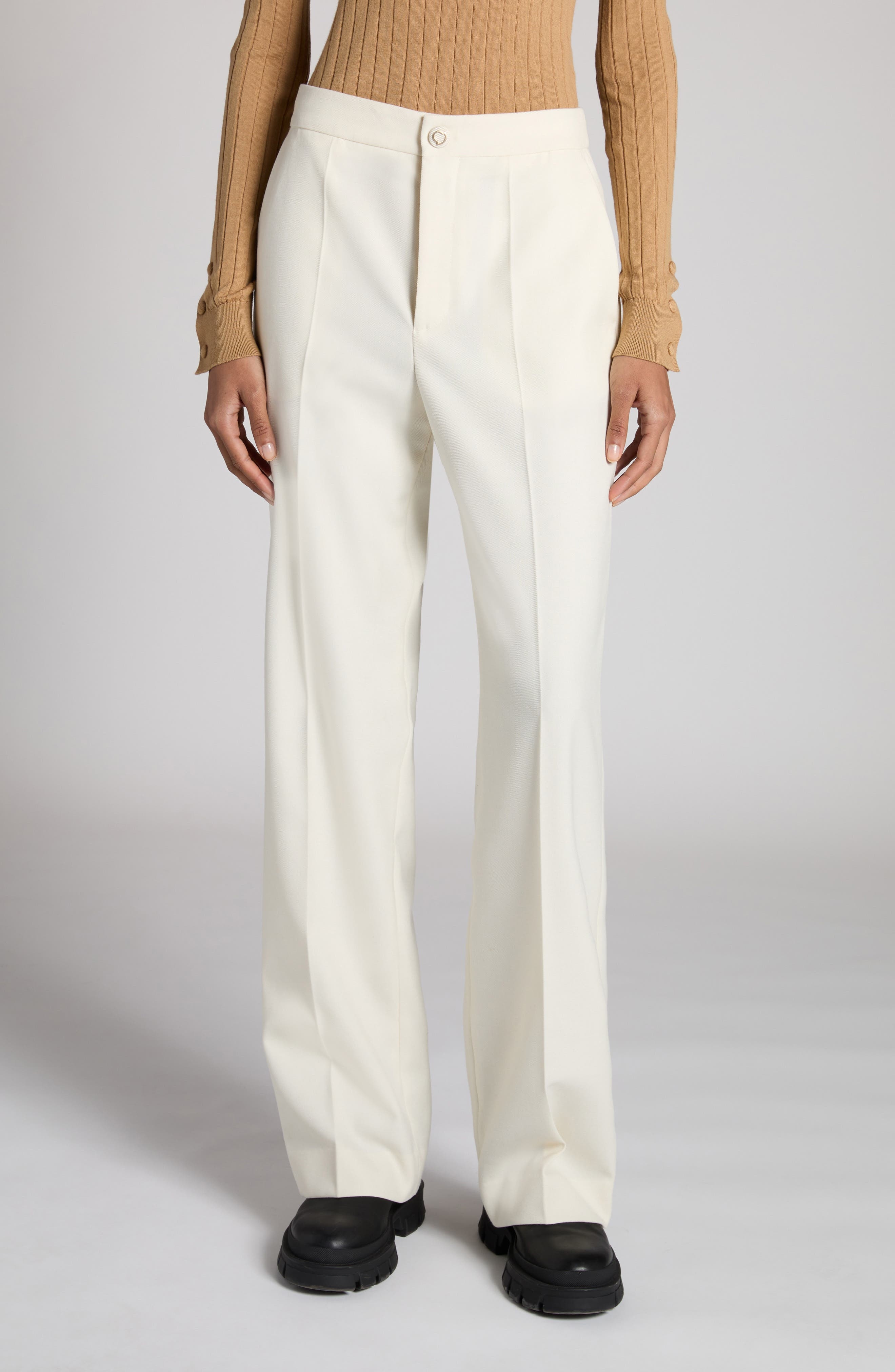 Sharp creases front and back underscore the polished look of straight-leg pants that are made of wool-enriched twill and finished with a logo-embellished snap. Zip fly with hook-and-eye closure Front slant pockets; back welt pockets 55% polyester, 45% wool Dry clean Imported Designer Clothing