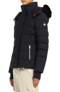 Temperature-rated to -4ºF and trimmed in soft genuine shearling at the hood, this water-repellent jacket will keep you warm in all kinds of weather without adding a lot of bulk. A two-way front zip closure and zippered hand pockets add convenience, and the down-filled stand collar helps to keep you cozy. 26" length Two-way front-zip closure with snap storm placket Stand collar; removable hood with removable genuine shearling (Spain) trim Ribbed cuffs Side zip pockets Temperature rated to -4°F/-20°C Water repellent; wind resistant Lined, with 90% goose down, 10% feather 800-fill-power fill 76% nylon, 24% elastane Machine wash, tumble dry; remove shearling for professional fur clean Made in Vietnam
