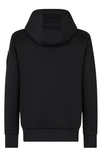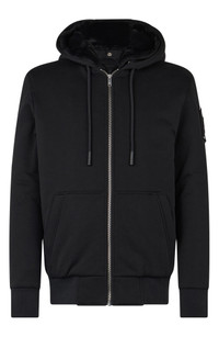 A gleaming logo plaque at the sleeve lends rich detail to a hoodie-inspired jacket fashioned with a removable faux-fur lining and a split kangaroo pocket. 27" length (size Medium) Drawstring hood Ribbed cuffs and hem Lined 100% polyester faux-fur lining 75% cotton, 25% polyester Machine wash, tumble dry Imported