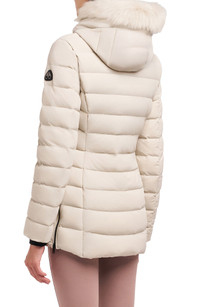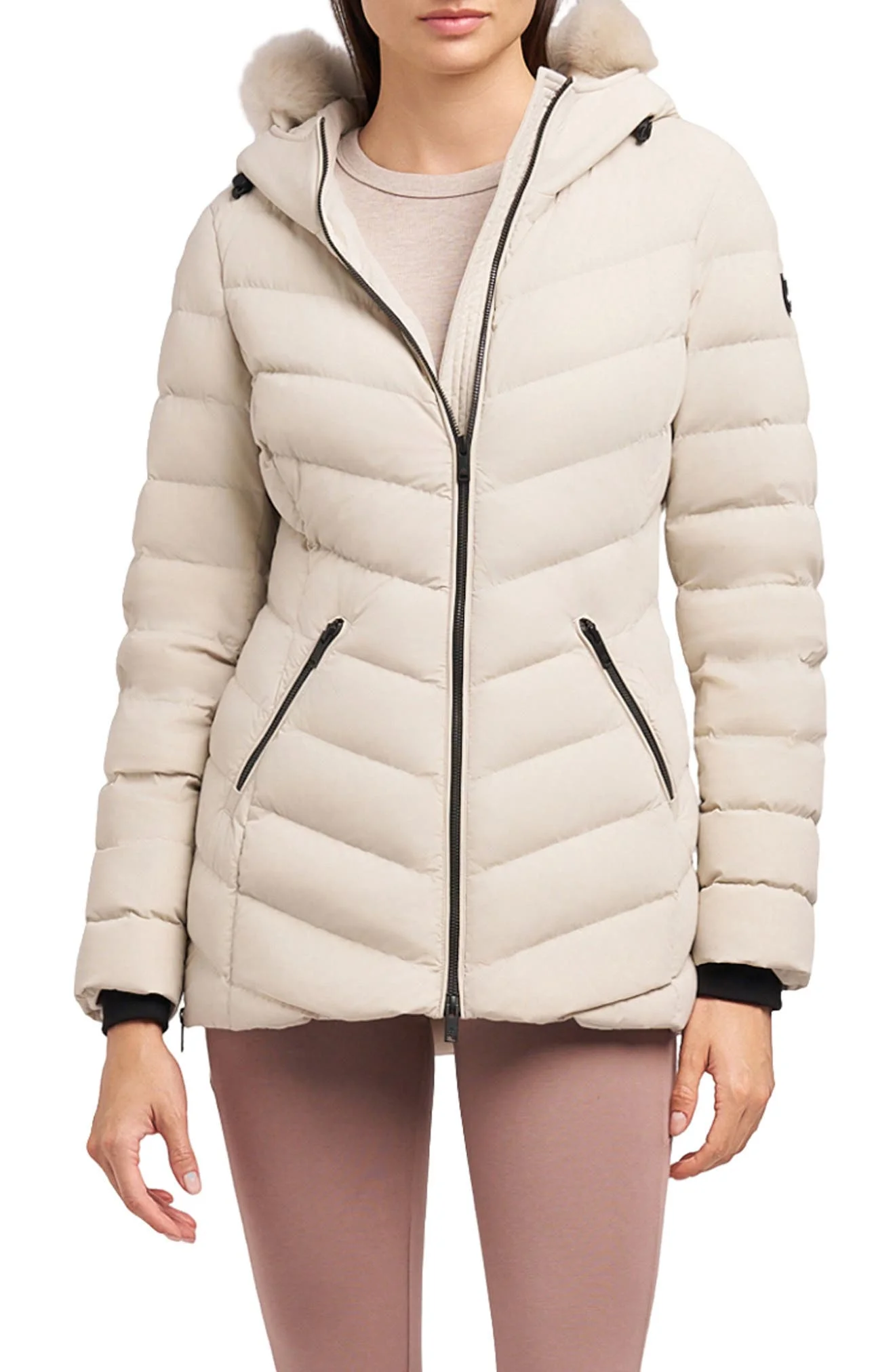 Your everyday life can't slow down when the weather turns cold, and this puffer jacket has the water-repellent protection and lightweight insulation to keep you warm without overheating. Genuine-shearling trim frames the hood to lock in heat and a fashionable wintry look. 33 1/2" length Two-way front-zip closure Stand collar; drawcord-toggle hood with removable genunine shearling trim Inset ribbed cuffs Side zip pockets Side vents with zip closures Temperature rated to 14°F/-10°C Water repellent; wind resistant Lined, with 800-fill-power 90% duck down, 10% feather fill 82% nylon, 18% elastane, with genuine shearling (China) trim Dry clean or machine wash, tumble dry; remove shearling for professional fur clean Imported