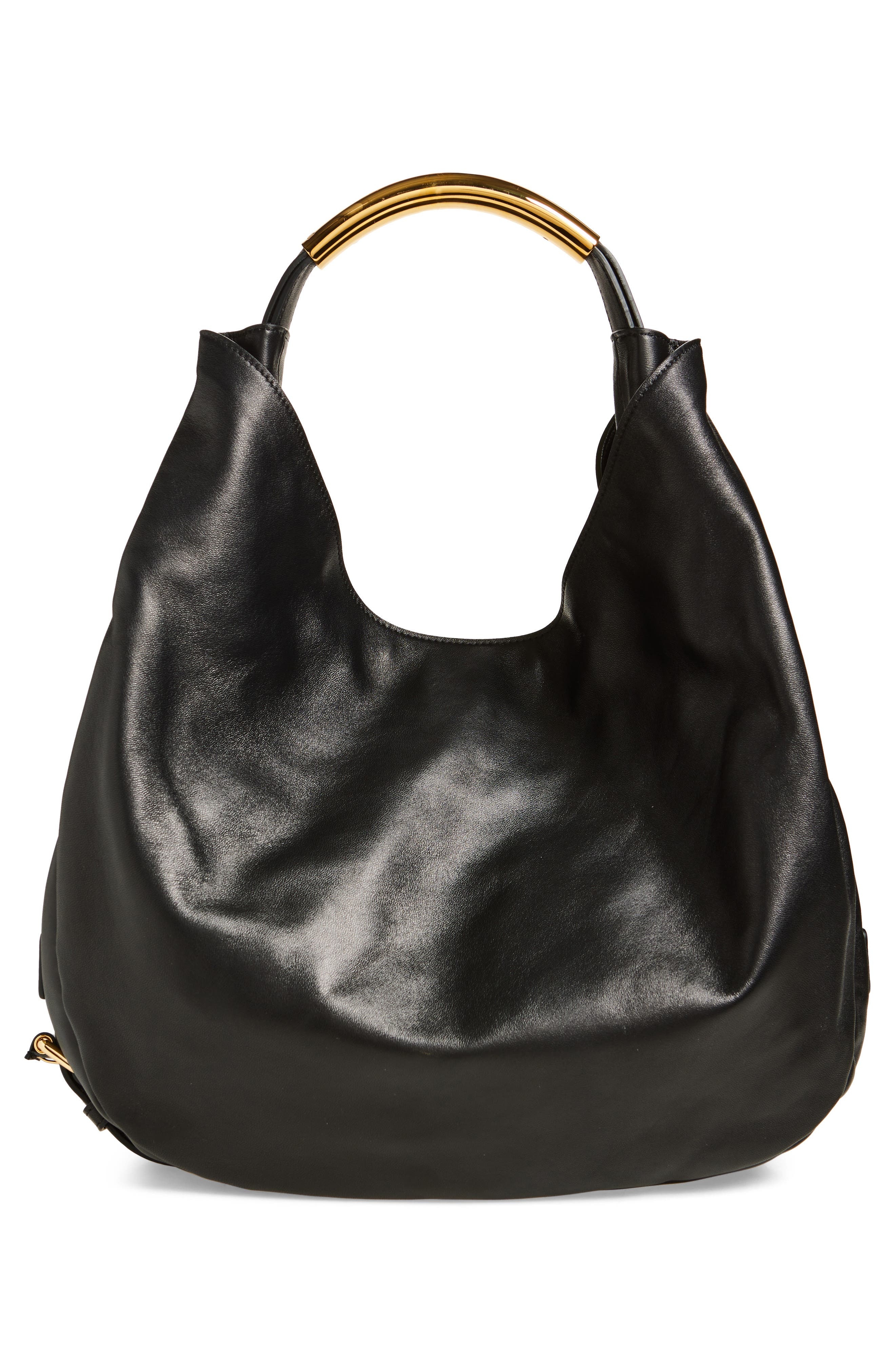 The signature tubular handle and surrounding strap shape this slouchy leather hobo bag boldly branded with gleaming logo hardware extending along the side. Magnetic closure Top carry handle Interior zip wall pocket Lined Leather Made in Italy Designer Handbags