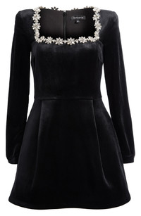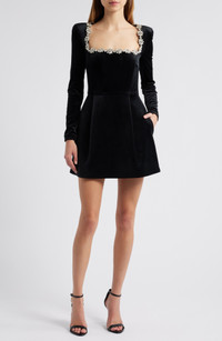 This opulent velvet fit-and-flare is made even more celebratory with sparkling crystal rosettes around the square neckline. The minidress is enhanced by shoulder pads and internal corset boning for shape and support. 32" length (size 8) Hidden back-zip closure Square neck Long sleeves Lined 93% polyester, 7% elastane Hand wash, dry flat Imported