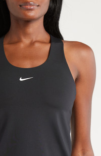 A built-in shelf-bra keeps you supported in this racerback tank top cut with signature Dri-FIT technology for cool, dry comfort as you work up a sweat. 20 1/2" length (size medium) Scoop neck Racerback Built-in shelf-bra Dri-FIT moisture-wicking technology 82% polyester, 18% spandex Machine wash, line dry Imported