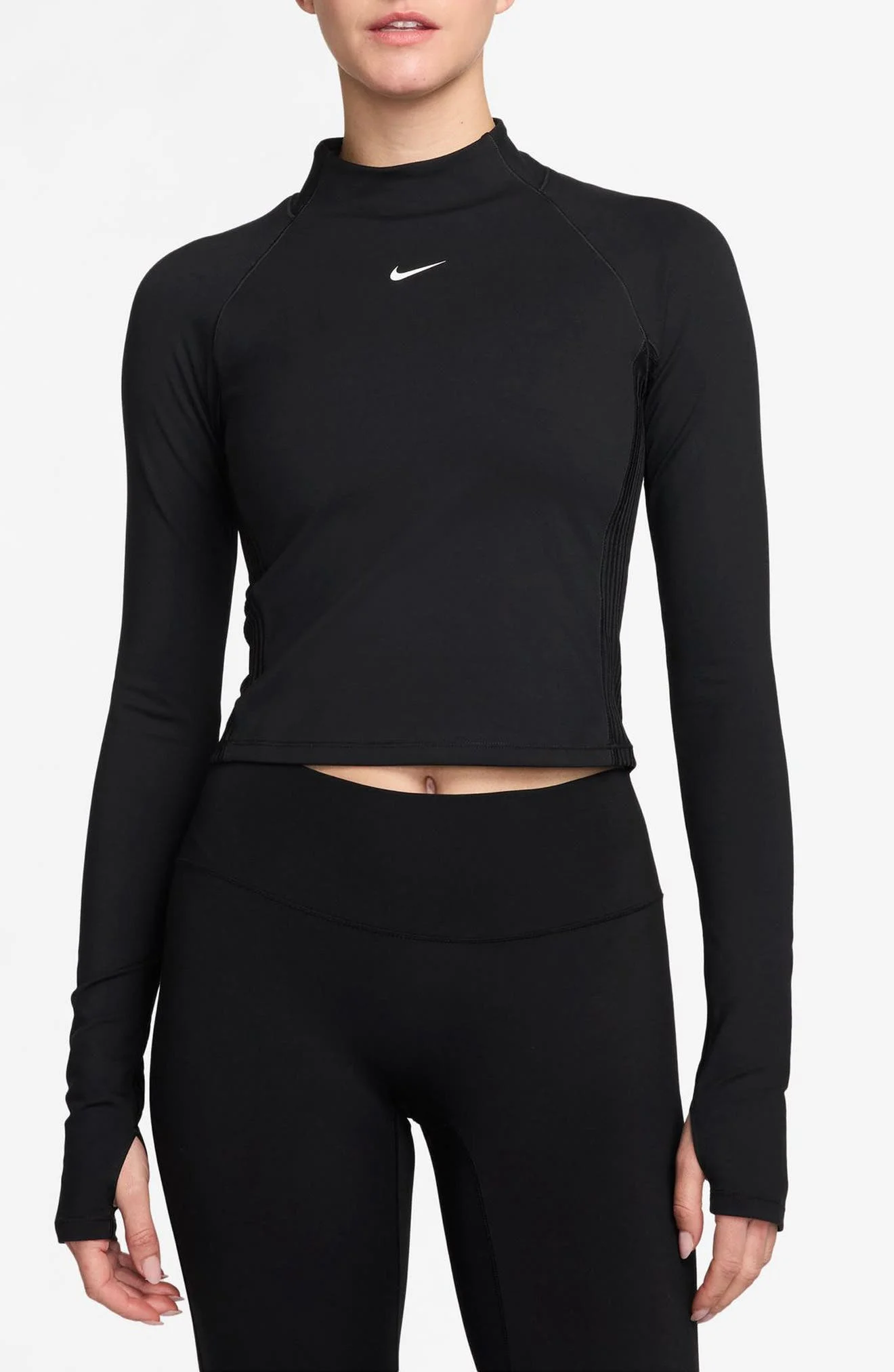 This body-hugging funnel-neck top made from the brand's midweight pro fabric delivers a smoothing sensation that elevates your workout look while Dri-FIT technology moves sweat away from your skin for quicker evaporation. Funnel neck Long sleeves Dri-FIT moisture-wicking technology 87% polyester, 13% spandex with 88% polyester, 12% spandex contrast Machine wash, line dry Imported