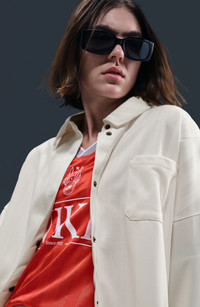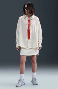 Dropped shoulders and a roomy silhouette create an effortlessly cool, slouchy fit in this zip-front shirt streaked with barely perceptible vertical stripes. Front zip closure Spread collar Long sleeves with button cuffs Chest patch pocket Curved hem 100% polyester Machine wash, line dry Imported Nordstrom x Nike: A curated lifestyle destination where fashion is the ultimate sport