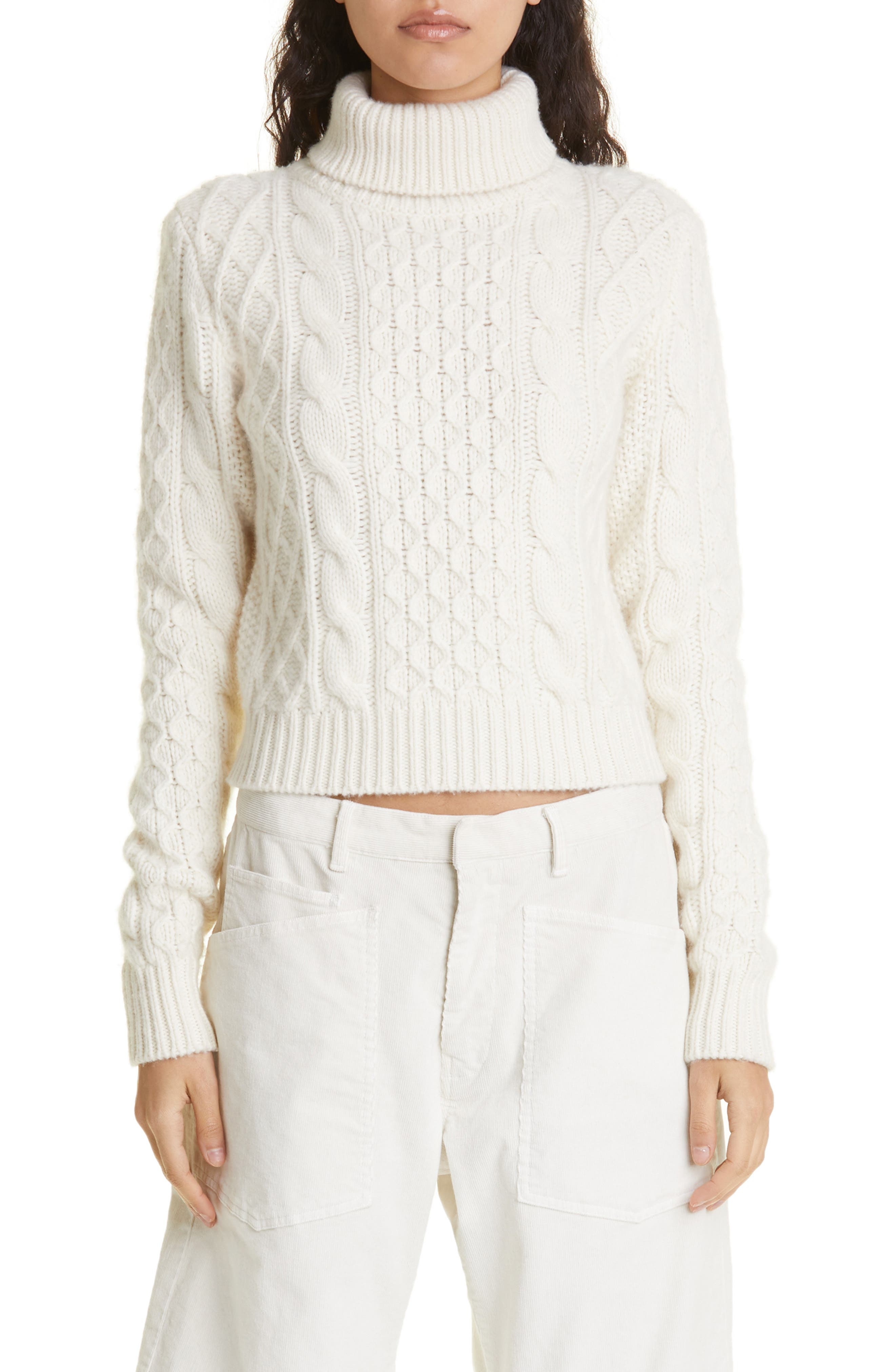 This cashmere-kissed turtleneck sweater is knit with textured cables in a cool cropped length. 21 1/2" length (size Medium) Turtleneck Long sleeves 70% virginwool, 30% cashmere Dry clean Imported
