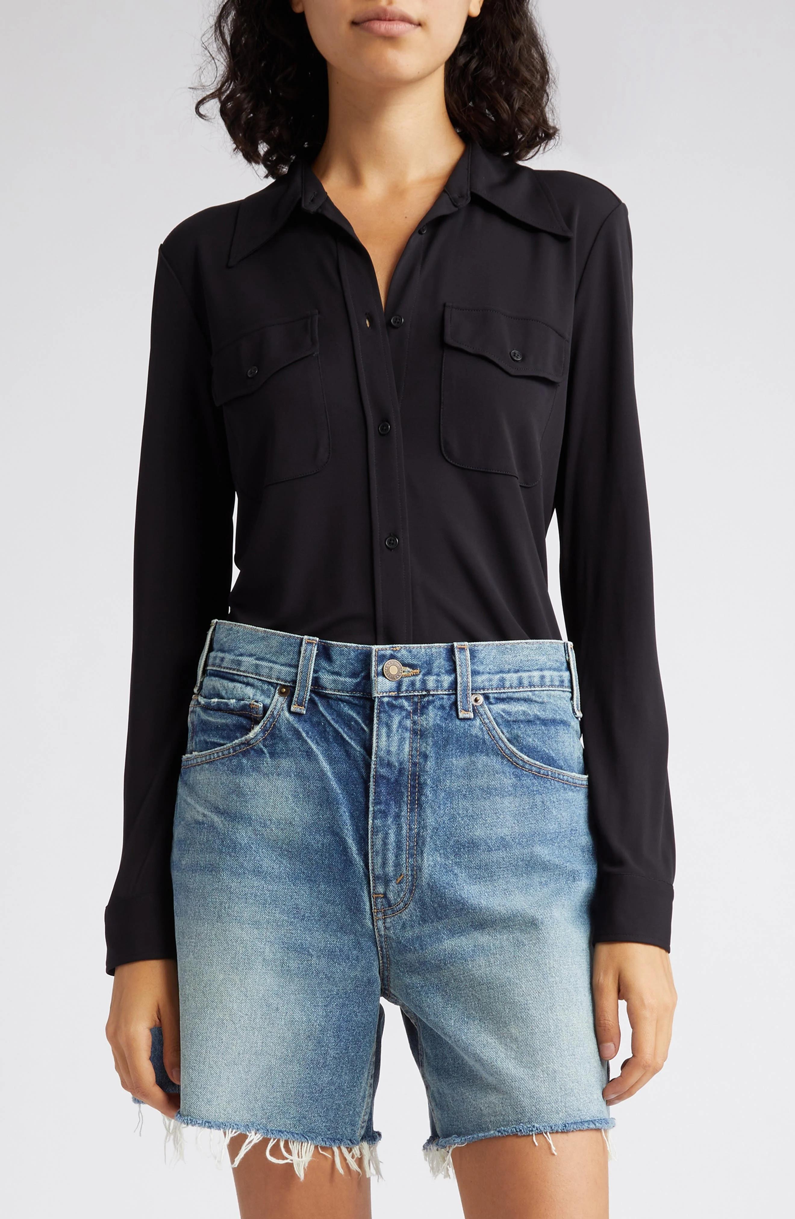 Be polished in this light and lovely shirt crafted with chest button-flap pockets. 23 1/2" length (size Medium) Spread collar Long sleeves 100% viscose Dry clean Made in the USA of imported fabric