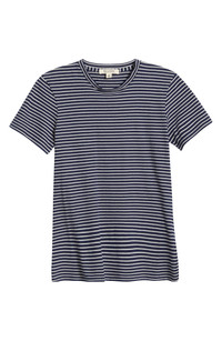 A crewneck gives casual energy to this striped T-shirt made of breathable cotton. Crewneck Short sleeves 100% cotton Dry clean Made in the USA