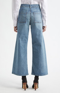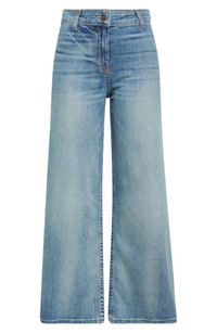 These comfortable and stretchy wide-leg jeans in a medium wash are a daily go-to when you want something a little more lightweight. 29 1/2" inseam; 21" leg opening; 10" front rise; 12" back rise (size 24) 98% cotton, 2% polyurethane Machine wash, tumble dry Made in the USA of imported fabric