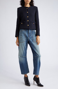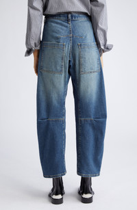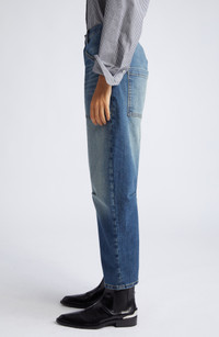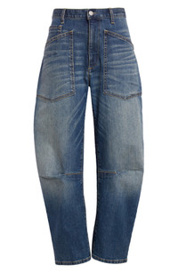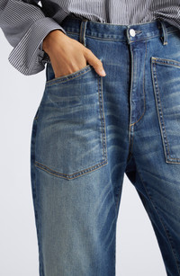 Made from faded denim with a hint of stretch, these jeans have relaxed barrel legs, seamed knees and utility pockets for a contemporary silhouette. 26" inseam, 17" leg opening; 11 3/4" front rise; 16" back rise (size 29) Zip fly with button closure Front patch pockets; back patch pockets 98% cotton, 2% polyurethane Hand wash, line dry Made in the USA