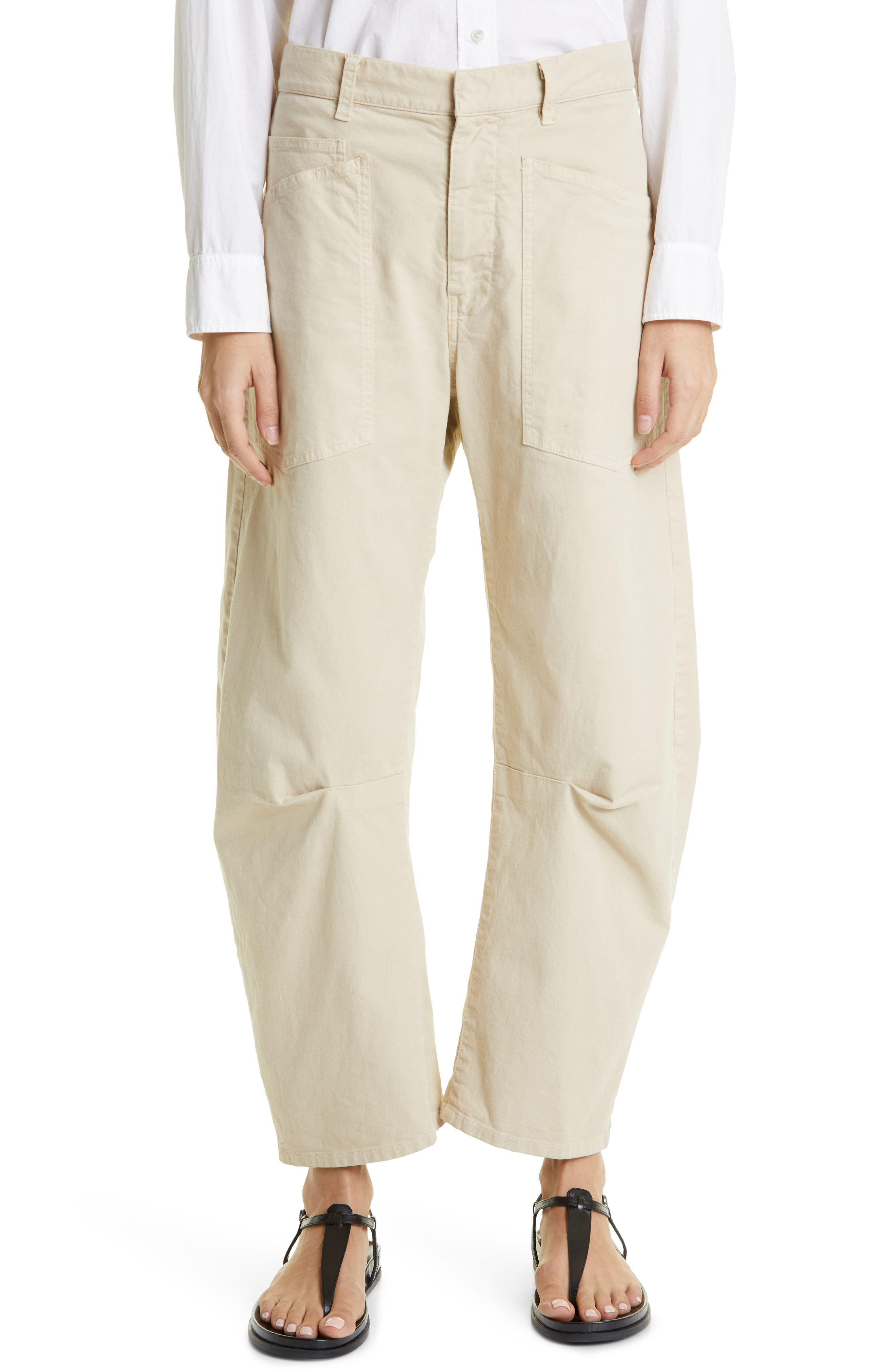 Darts at the knees exaggerate the curved, structured shape of cropped pants crafted from cotton stretch twill. Low-slung back pockets further play up the slouchy proportions. 27" inseam; 18" leg opening; 11 1/2" front rise; 11 1/2" back rise (size 8) Zip fly with hook-and-bar closure Front and back patch pockets 98% cotton, 2% elastane Dry clean or machine wash, tumble dry Made in the USA of imported fabric via C