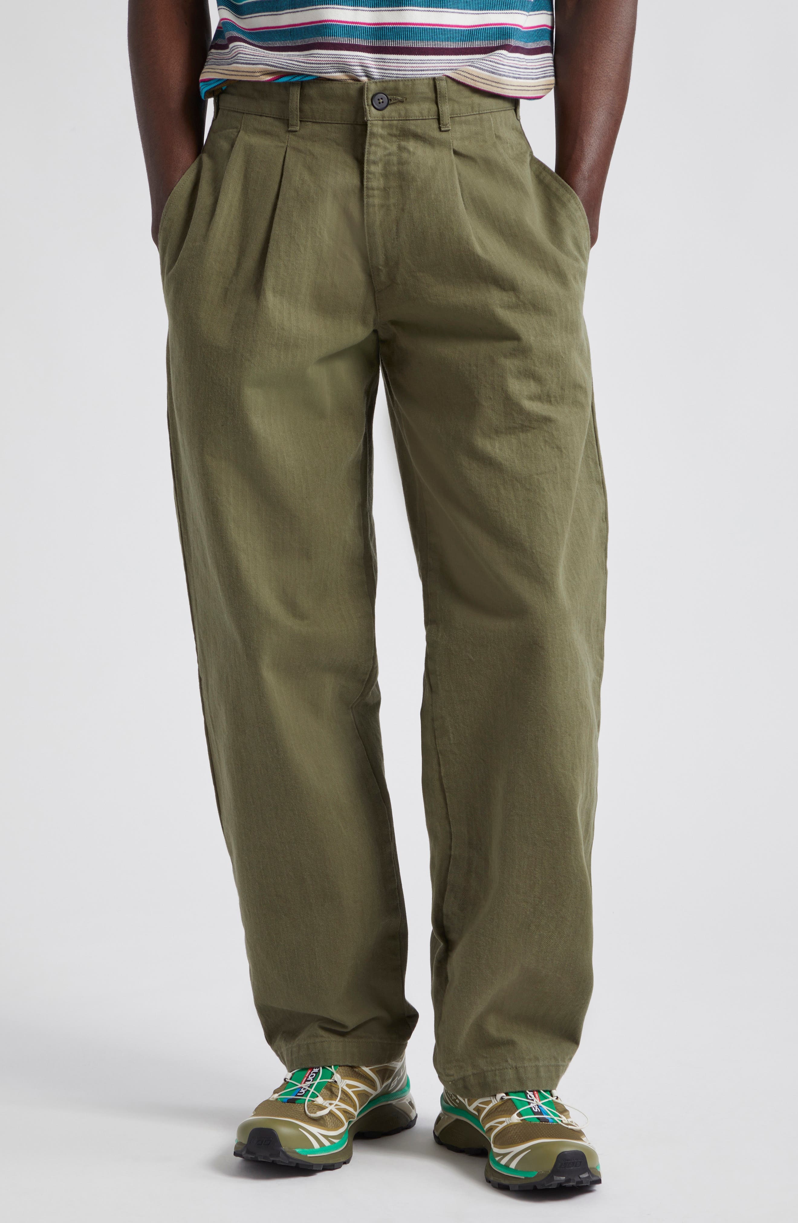 Straight-Leg Pleated Herringbone Cotton Trousers Green