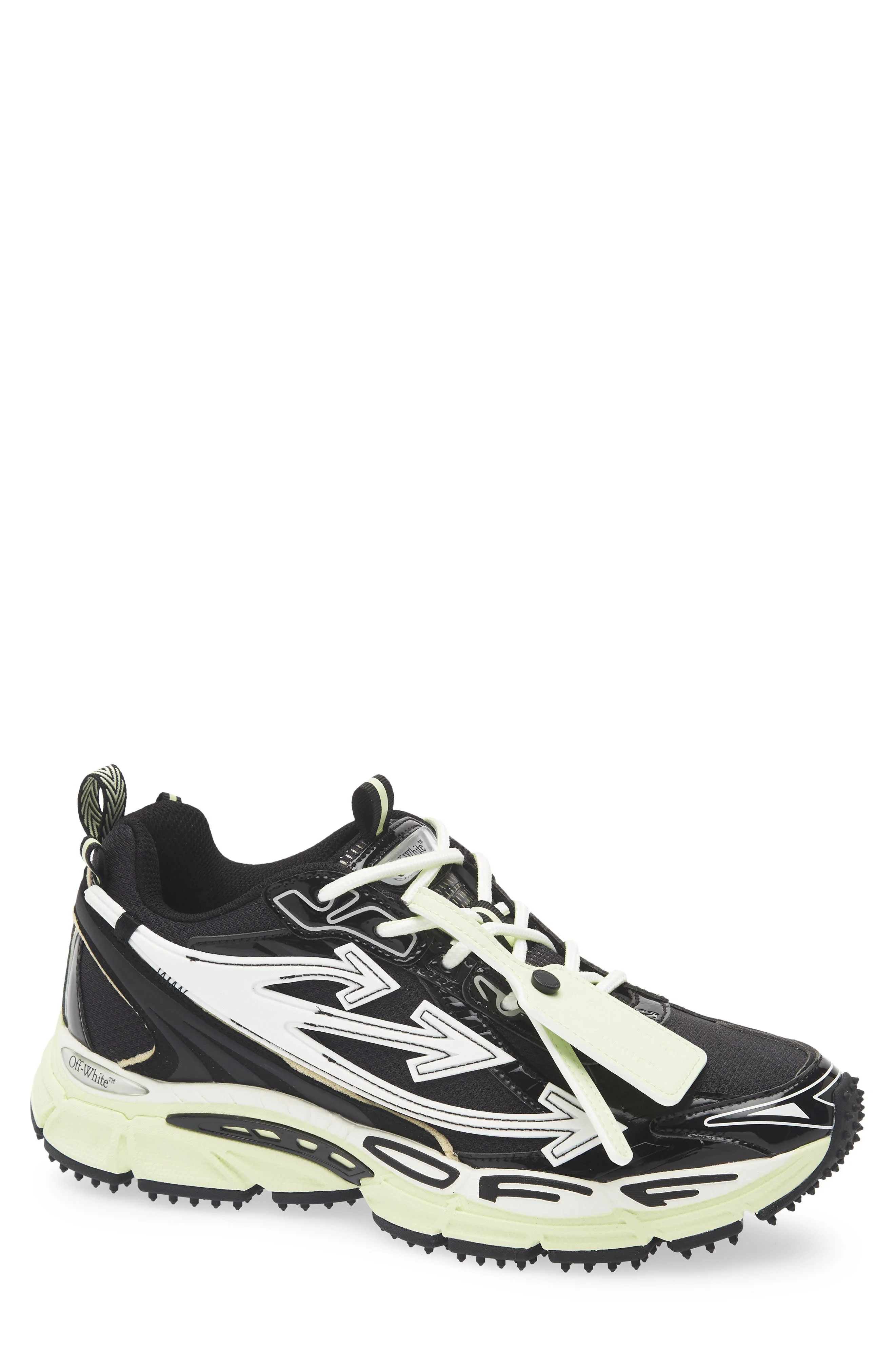 Spiky pebbles stud the sole of a heavily layered sneaker that serves signature Off-White style with swooping arrows and a matching zip tag. Lace-up style Textile and synthetic upper/textile lining/synthetic and rubber sole Imported Designer Shoes Black Owned/Founded