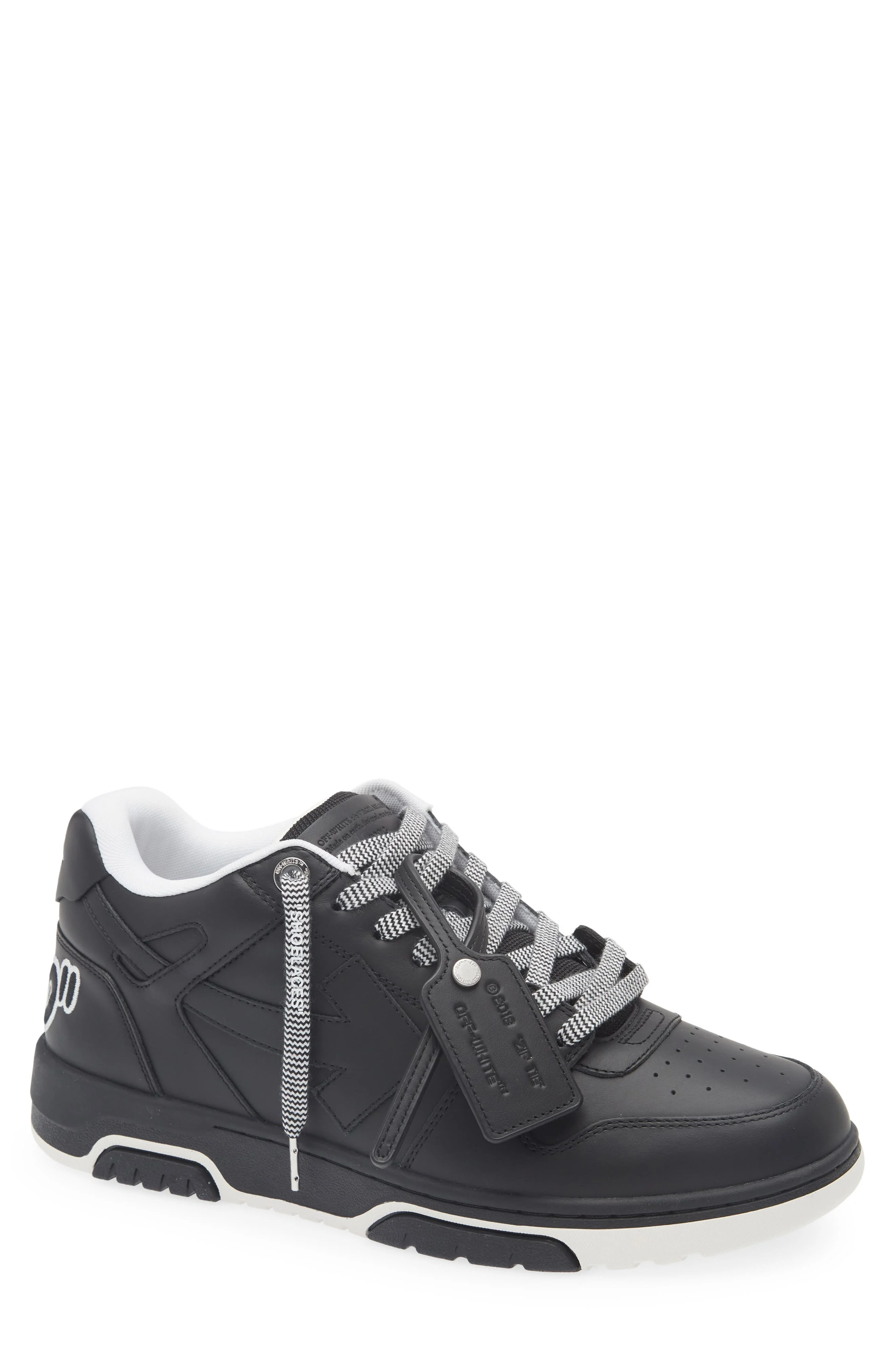 Off-White looks to '80s and '90s athletic shoes to create a modern sneaker that sports a low profile with nods to street, basketball and runner aesthetics. Directional arrows and a matching zip tag score winning sneakerhead points, while large 'OOO' embroidery details the counter. Lace-up style Leather and textile upper/textile lining/synthetic sole Imported Designer Shoes Black Owned/Founded