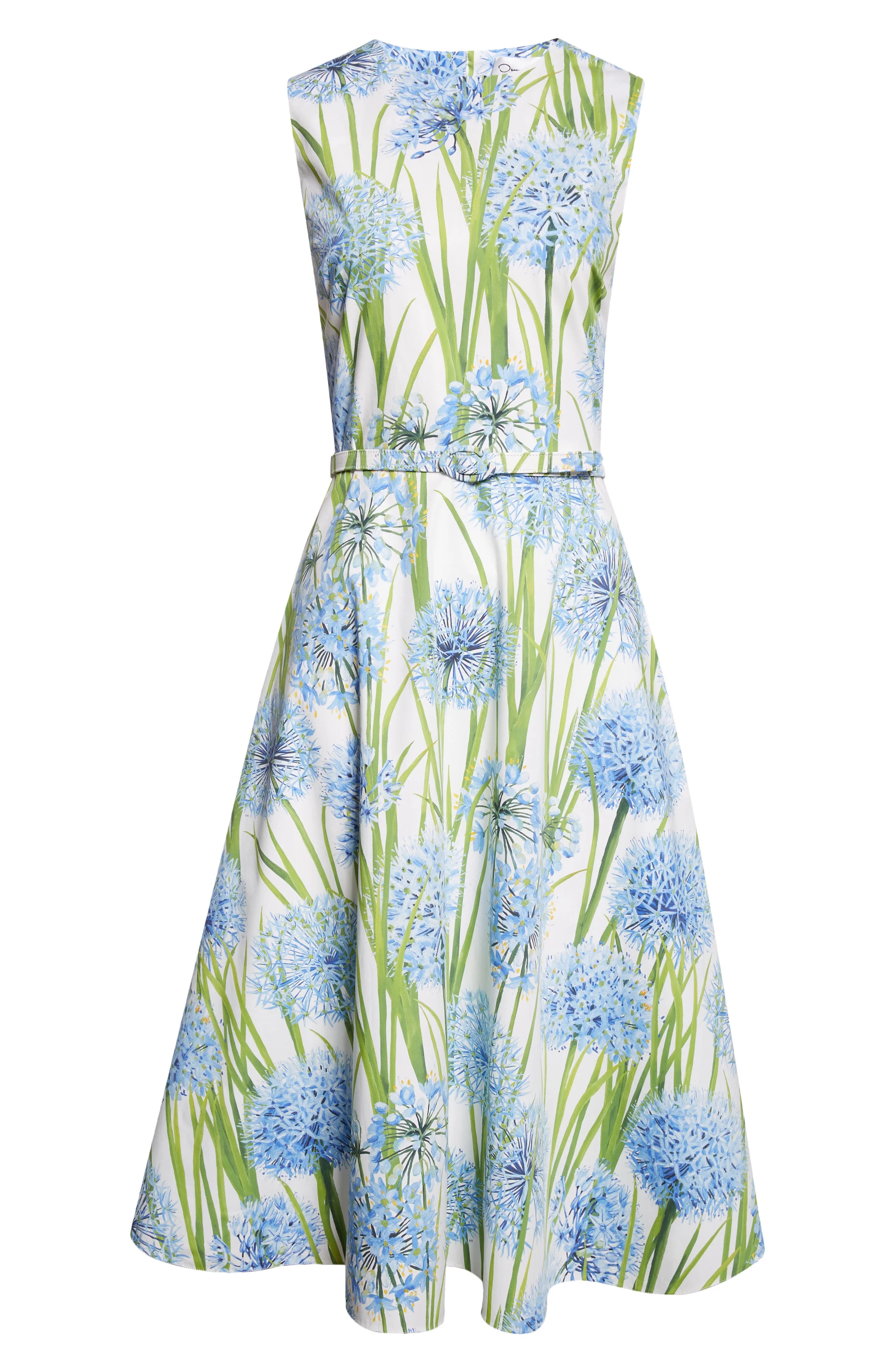 Crisp cotton poplin enhances the structure of a tailored dress defined by a belted waist, short sleeves and a gently flared skirt. Magnified allium blooms unfurl with painterly clarity, bringing bold elegance to a classic form. Hidden side-zip closure Jewel neck Sleeveless Adjustable belt Cotton lining 97% cotton, 3% elastane Dry clean Made in Italy Designer Clothing