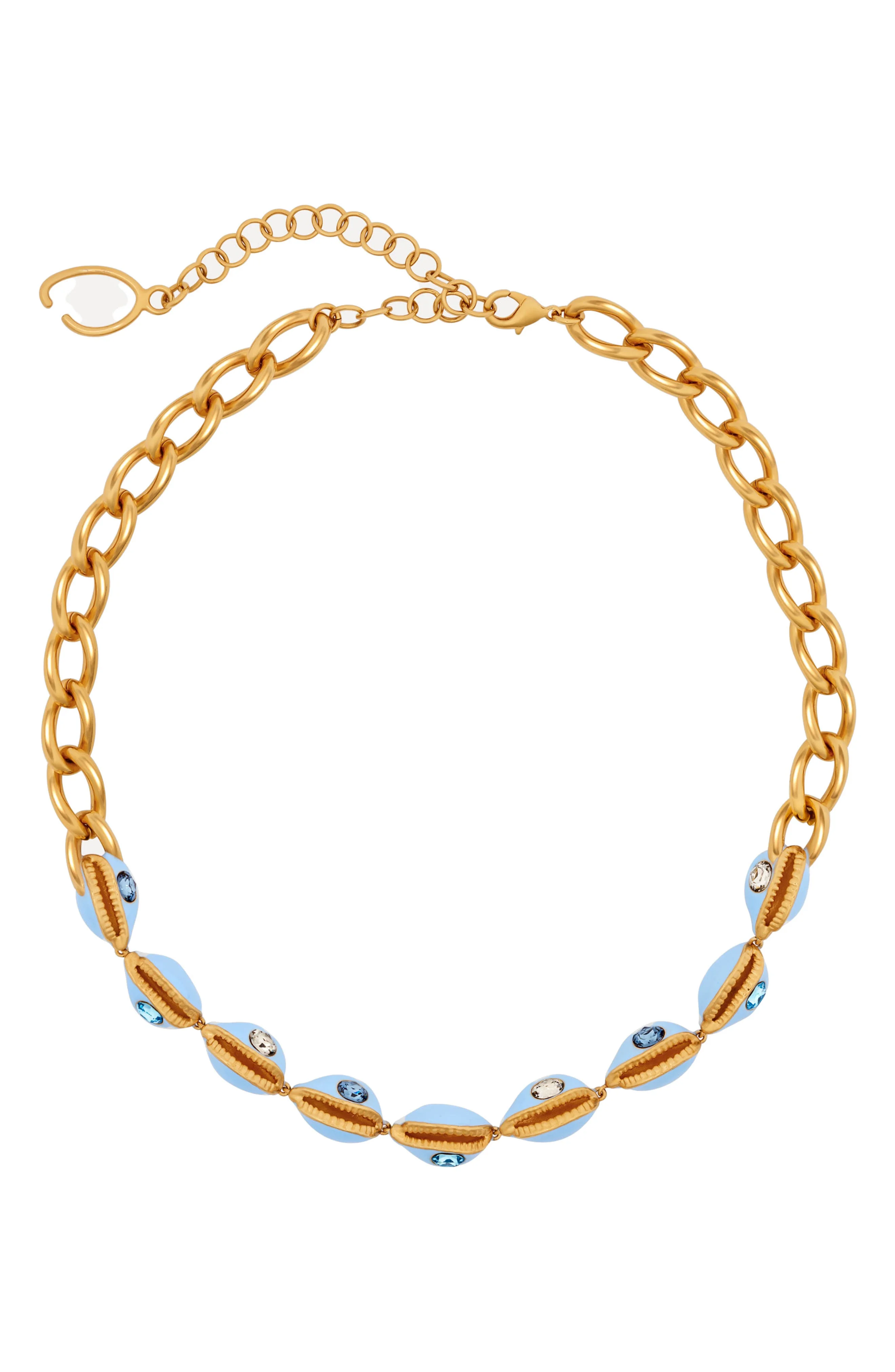 Golden cowrie shells get an ocean-inspired wash of blue enamel in this warm-meets-cool collar necklace. Brass/glass/enamel Made in Italy