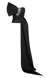 A sweeping bow masterfully draped to cascade in fluid lines defines this bustier-inspired top that's a sculptural study in drama and elegance. Light-catching crystal embroidery in a floral motif adds an opulent finish. Hidden back-zip closure Strapless 100% cotton with 100% silk contrast Dry clean Made in the USA Designer Clothing