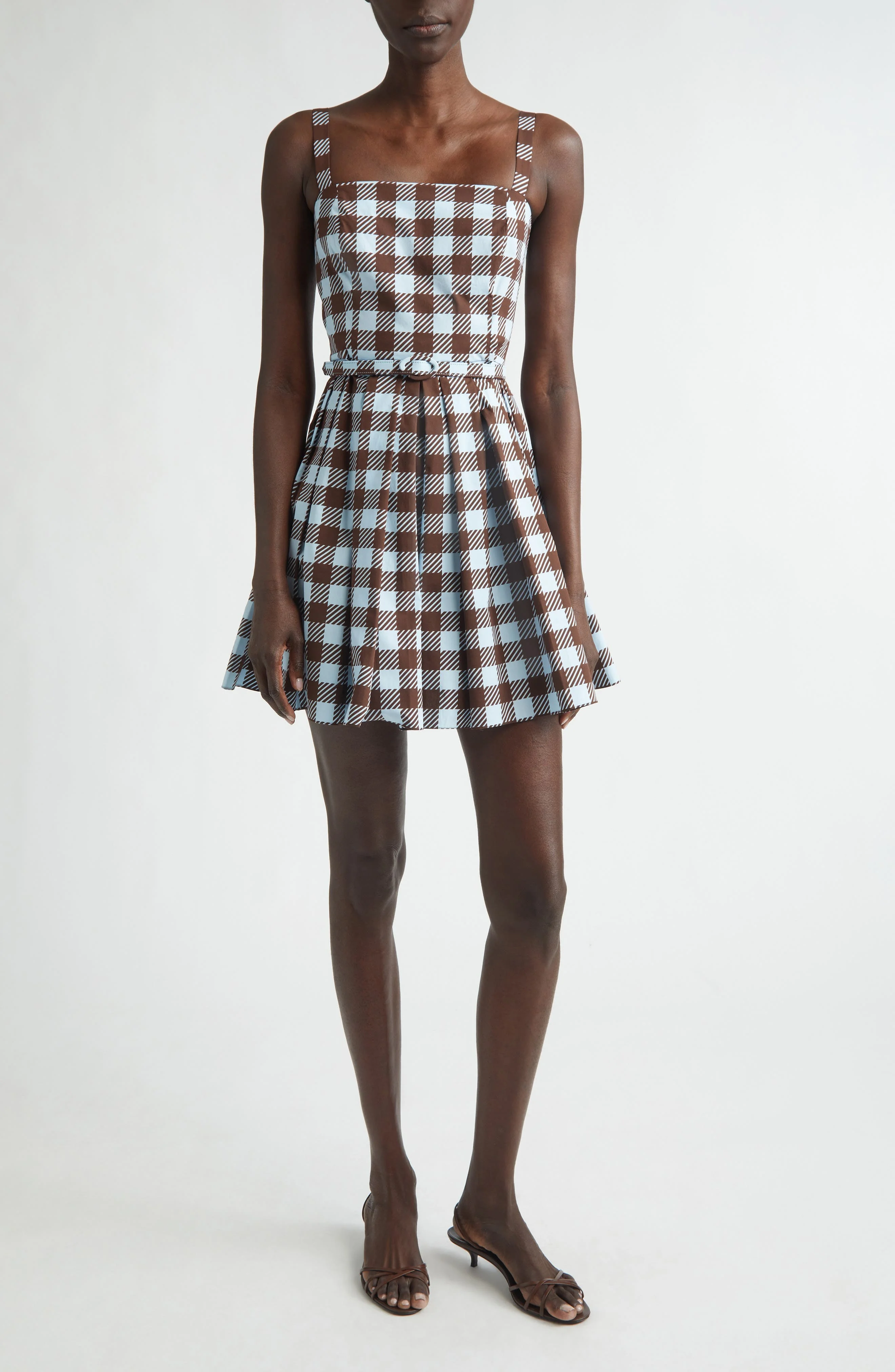 The ice-blue and mahogany hues of the brand's spring '26 gingham bring rich tone as the patterning highlights the geometric bodice and pleated skirt on this fit-and-flare minidress. Hidden back-zip closure Square neck Removable belt 97% cotton, 3% elastane Dry clean Made in Italy Designer Clothing