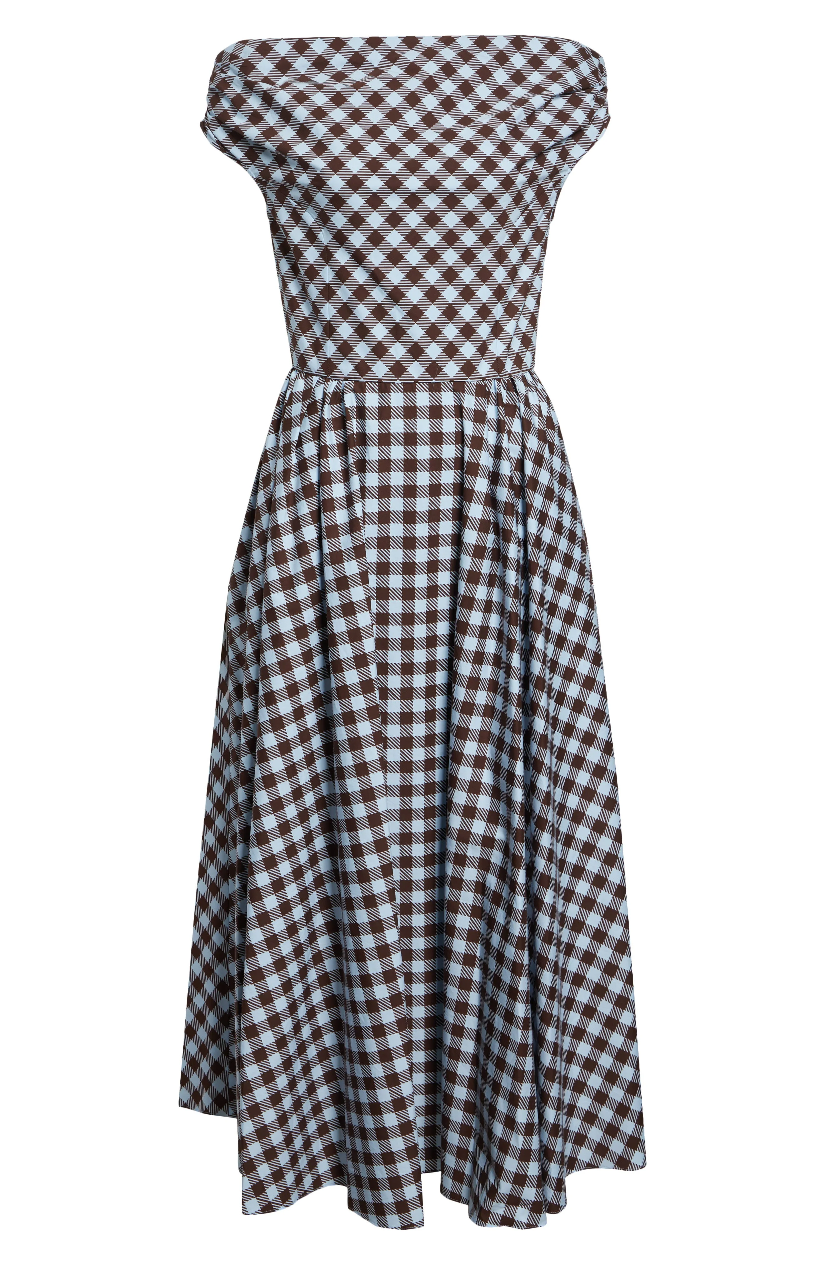 Rendered in crisp cotton poplin enhanced with stretch, this midi dress features a bold gingham print in contrasting tones of ice blue and mahogany. The shoulder-baring, bias-cut bodice contrasts with the gracefully pleated skirt, while a narrow belt pulls the look together with ease. Hidden back-zip closure Off-the-shoulder neck Short sleeves Side-seam pockets Removable belt 97% polyester, 3% elastane Dry clean Made in Italy Designer Clothing