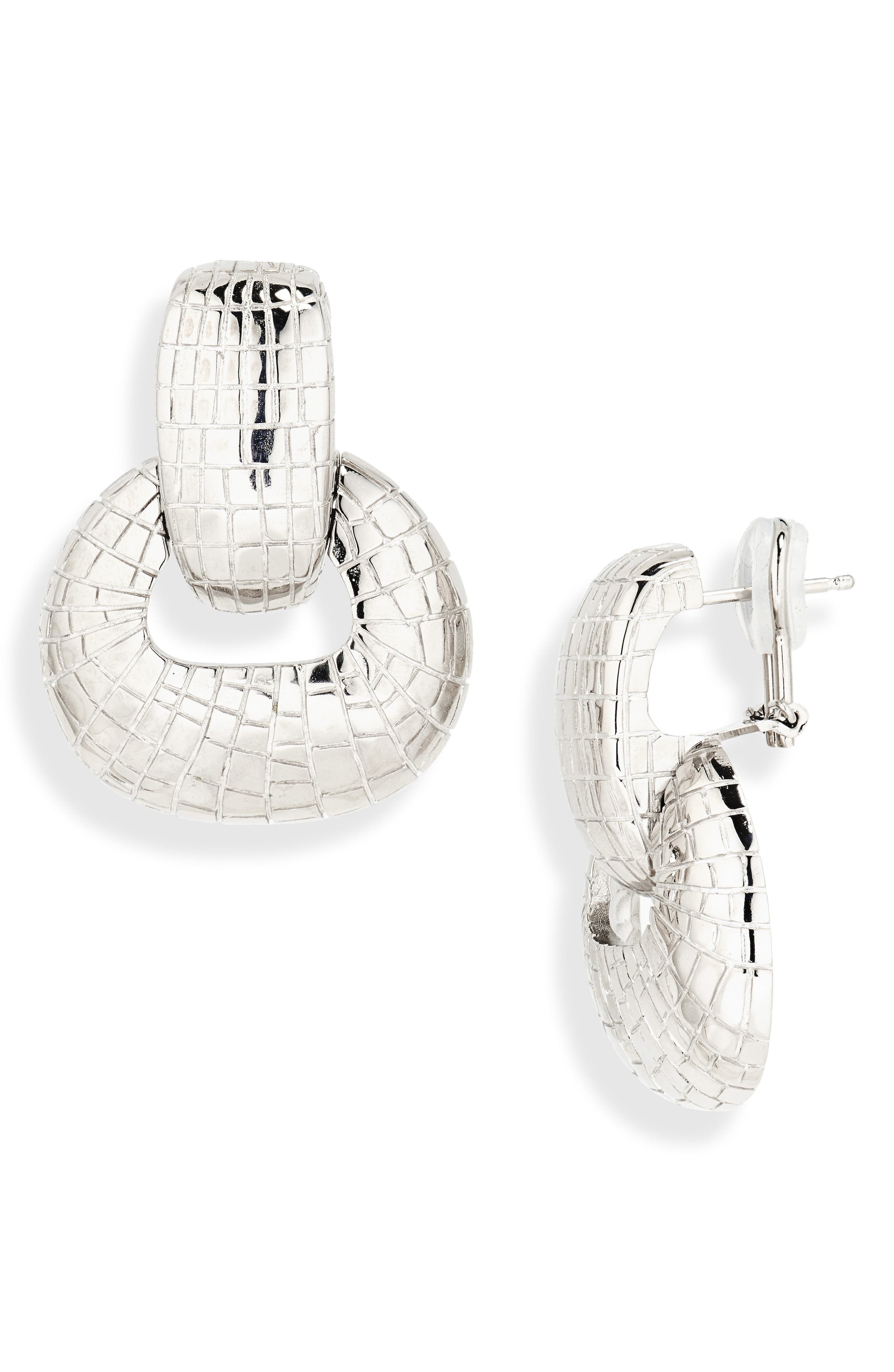 An ornately tiled texture brings mosaic-inspired artistry to these chunky doorknocker-style earrings that bring drama to your ensemble. Snap-post closure Silvertone plate Made in Italy