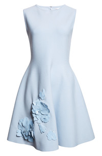 Sequin-embroidered peonies pop from the dramatically flared silhouette of a party-ready dress cast in a powder-blue hue. Hidden back-zip closure Jewel neck Sleeveless 70% viscose, 30% polyester Dry clean Made in Italy Designer Clothing