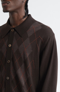 Featured in the fall ’25 lookbook, this wool cardigan weighs polish against grit. The body falls easy and square while a collared neckline adds a posh finishing touch. Shadowy argyle at the front is disrupted by intentionally unfinished edges so the motif feels ghosted rather than strict. Front button closure Point collar Long sleeves Dropped shoulders Ribbed cuffs and hem 100% wool Dry clean or hand wash, dry flat Made in Portugal Designer Clothing