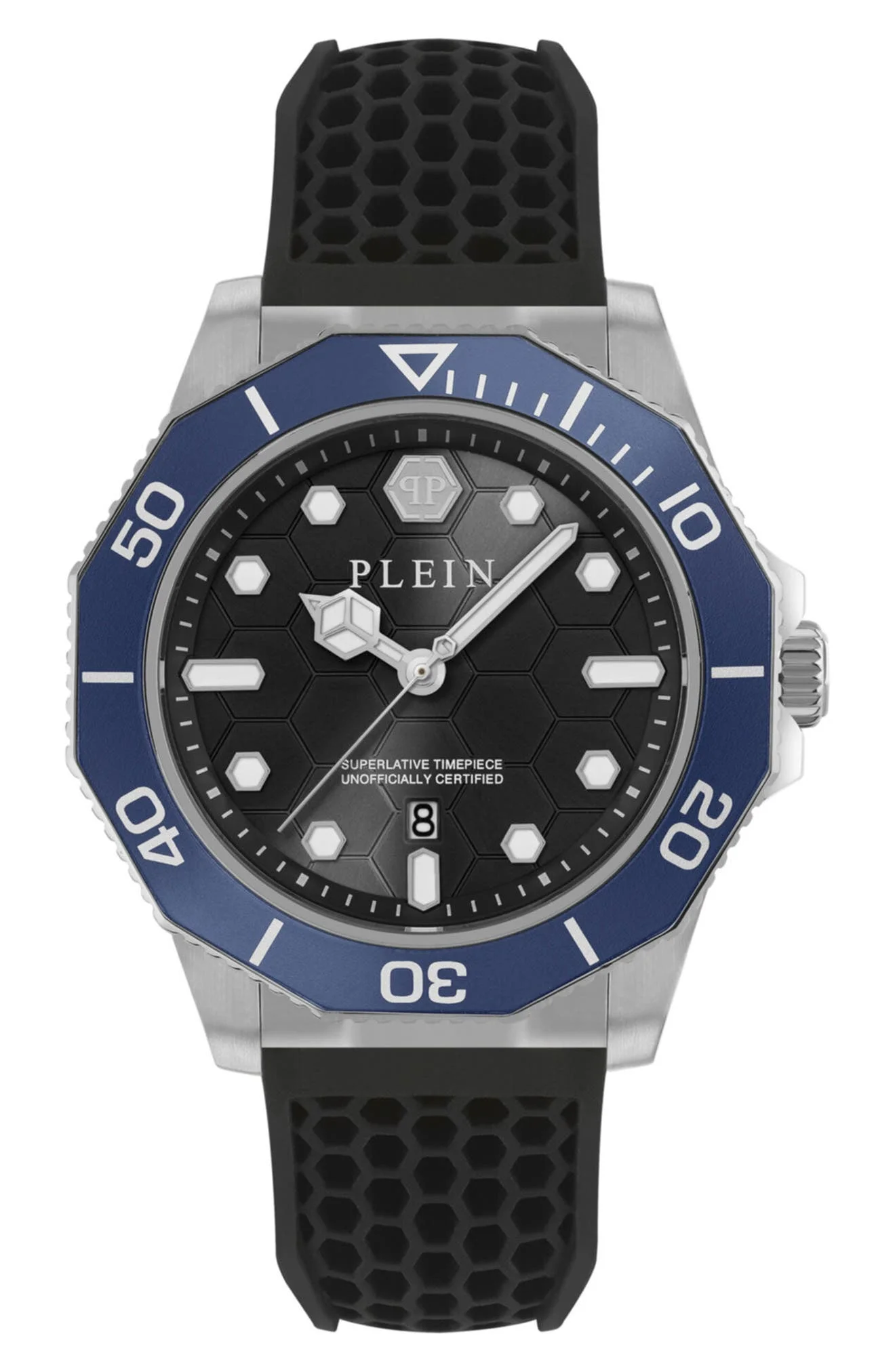 Functional features are also fashionable callouts for this boldly styled watch with its honeycomb-patterned dial, art deco hands and eye-catching rotating bezel.Measurements: 44mm case; 11.5mm case depth; 22mm band width.Strap/closure: Silicone strap with adjustable buckle closure.Movement: Three-hand Japanese quartz movement. Quartz movement: powered by a battery and features an internal electrical circuit to control the rate of the watch's ticking.Complications: Date window.Other features: Unidirectional rotating bezel; hexagon-guilloche dial; Super-LumiNova® hands and markers.Face: Mineral crystal. Stainless steel/silicone Imported