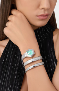 A hexagonal case heads this snake-inspired watch completed by a polished wraparound bracelet, creating a captivating silhouette on your wrist.Measurements: 28mm case; 7.7mm case depth; 9mm band width.Strap/closure: Wraparound bracelet strap.Movement: Two-hand quartz movement. Quartz movement: powered by a battery and features an internal electrical circuit to control the rate of the watch's ticking.Other features: Turquoise-enamel dial; three crystal markers.Face: Mineral crystal face. Stainless steel/crystal/enamel Imported
