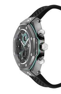 The brand's skull-and-crossbones logo centers the top subdial on this industrial-edged chronograph styled with a screwed together brushed stainless steel case and complemented with a comfortable, adjustable silicone strap.Measurements: 46mm case; 13mm case depth; 17mm band width.Strap/closure: Silicone strap with adjustable buckle closure.Movement: Three-hand quartz movement. Quartz movement: powered by a battery and features an internal electrical circuit to control the rate of the watch's ticking.Complications: Date window; elapsed-seconds, -minutes and -hours subdials.Other features: Super-LumiNova® hands and markers.Face: Mineral crystal face. Stainless steel with gunmetal ionic plate/silicone Imported