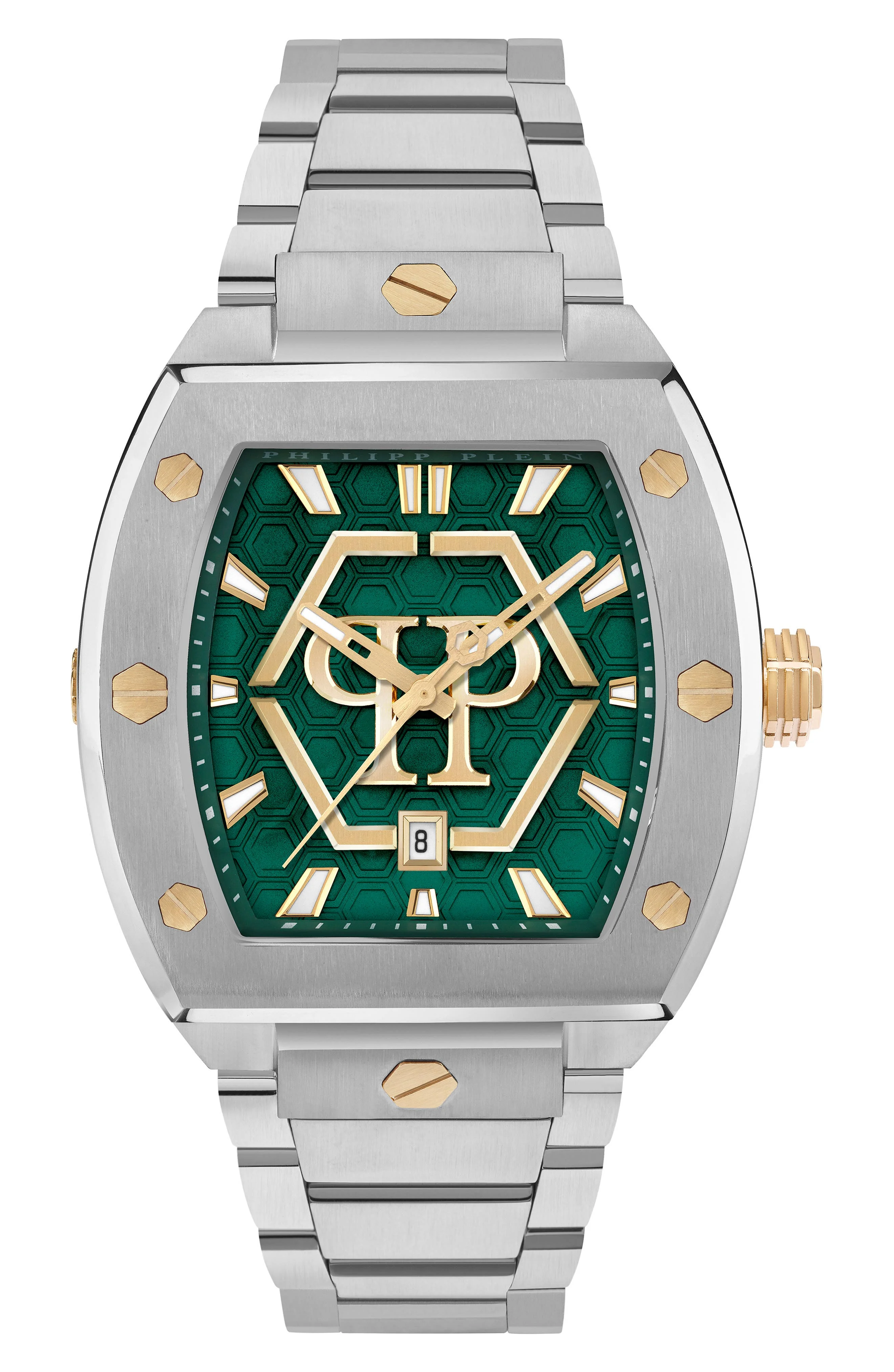 Layers and levels of hexagons—the brand's iconic framing of its logo—haunt the dial and the screws around the tonneau case on this sleek Phantom version of the Hexagon watch.Measurements: 44mm x 56.2mm case; 13.65mm case depth; 18.5mm band width.Strap/closure: Bracelet strap with deployant clasp closure.Movement: Three-hand Japanese quartz movement. Quartz movement: powered by a battery and features an internal electrical circuit to control the rate of the watch's ticking.Complications: Date window.Other features: Hexagon-guilloche dial; Super-LumiNova® hands and markers; screw-in caseback.Face: Mineral crystal face. Stainless steel/goldtone plate Made in Japan
