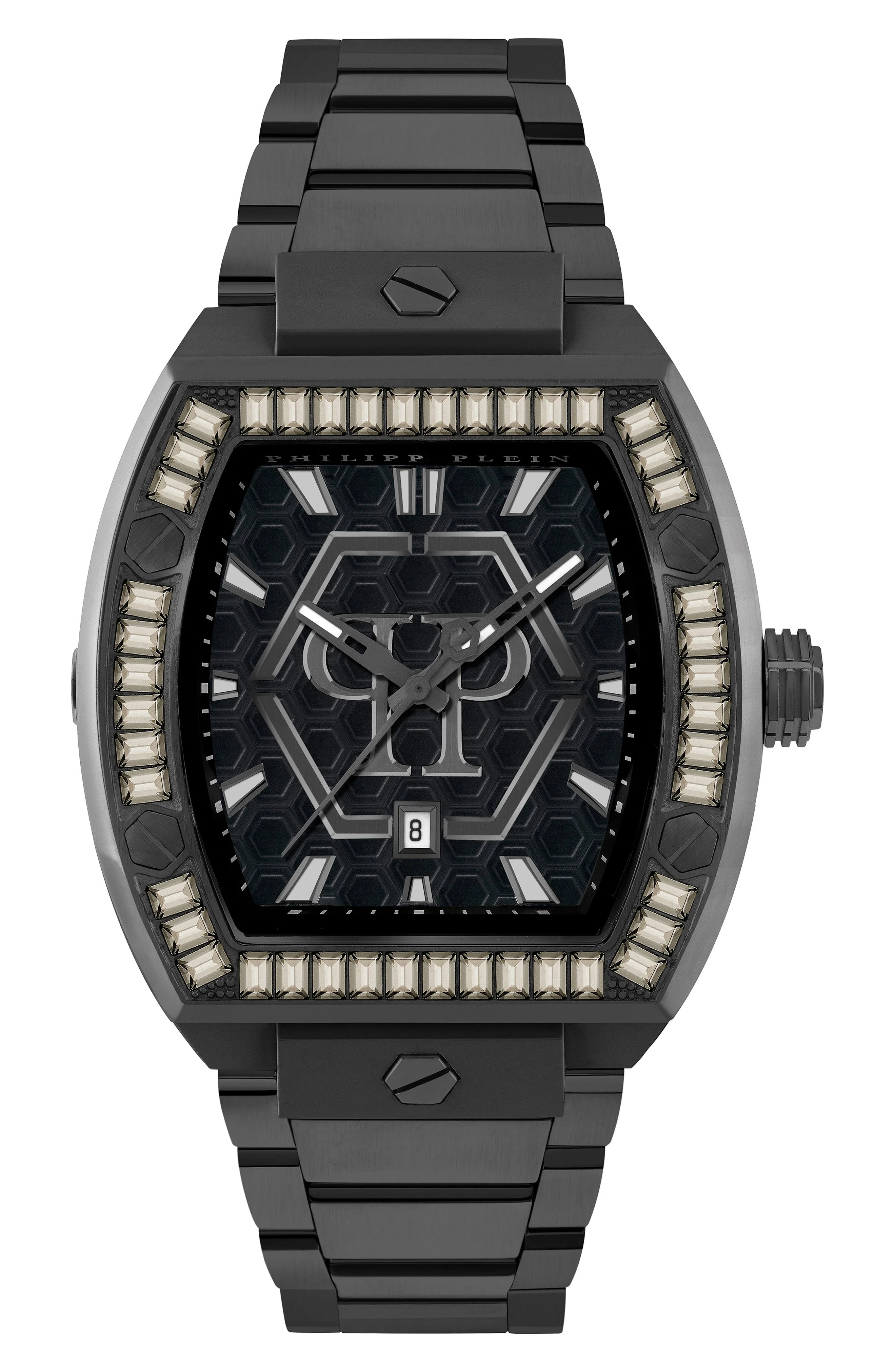 Layers and levels of hexagons—the brand's iconic framing of its logo—haunt the dial and the screws around the tonneau case on this sleek Phantom version of the Hexagon watch.Measurements: 44mm x 56.2mm case; 13.65mm case depth; 18.5mm band width.Strap/closure: Bracelet strap with deployant clasp closure.Movement: Three-hand Japanese quartz movement. Quartz movement: powered by a battery and features an internal electrical circuit to control the rate of the watch's ticking.Complications: Date window.Other features: 44-crystal bezel; hexagon-guilloche dial; Super-LumiNova® hands and markers; screw-in caseback.Face: Mineral crystal face. Stainless steel/black ionic plate/glass Made in Japan