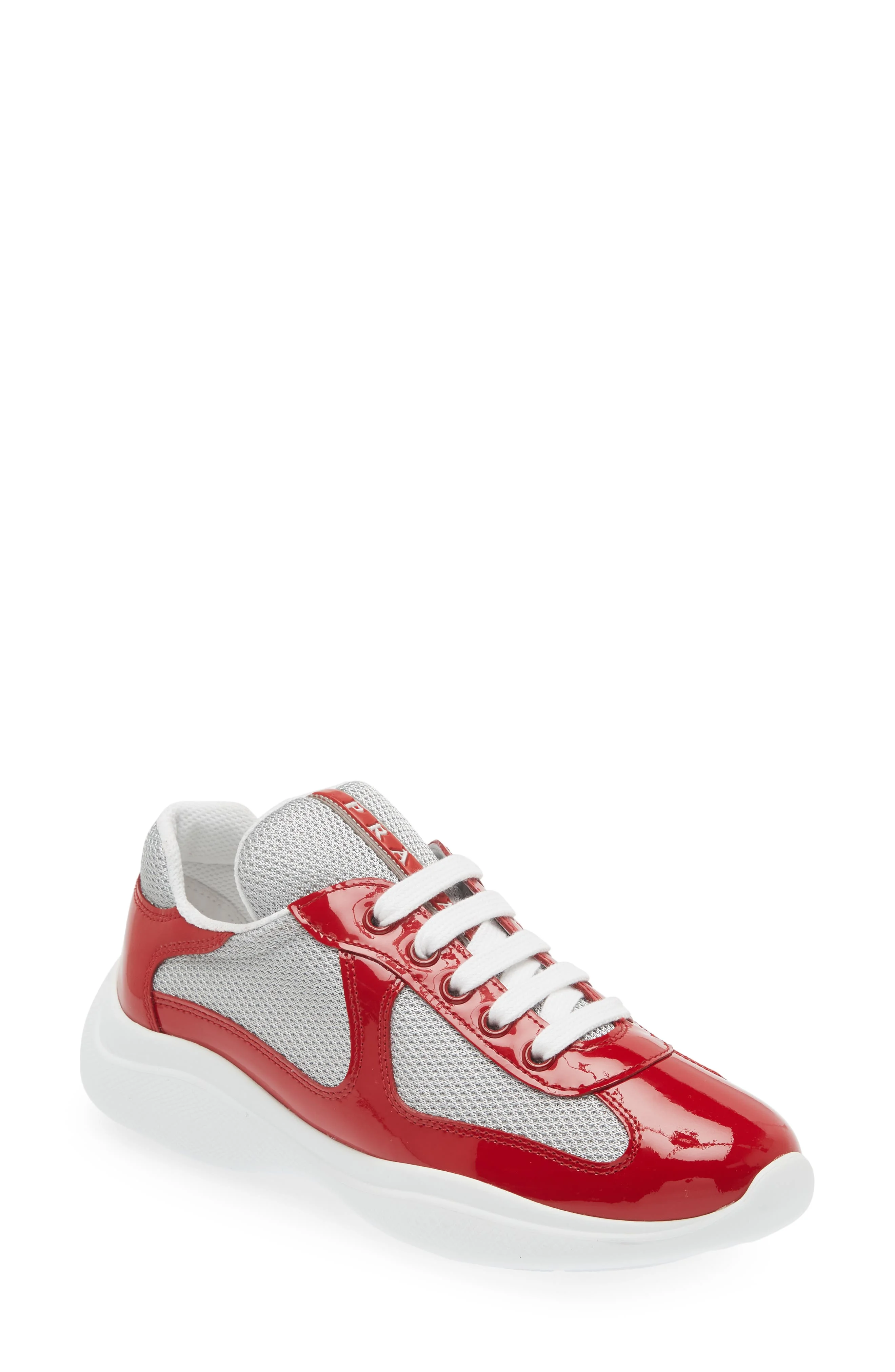 Modern mesh inlays add a touch of texture to a sporty sneaker formed from high-shine patent leather. Removable insole Leather and textile upper and lining/rubber sole Made in Italy Designer Shoes
