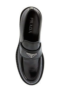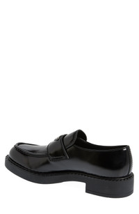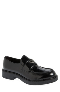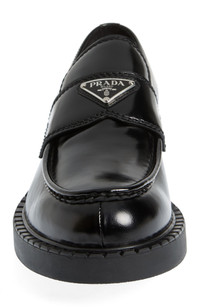 Prada's iconic triangular logo shines on a brushed-leather loafer tastefully updated with a ridged welt resembling tiny chocolate bars. Leather upper and lining/rubber sole Made in Italy Men's Designer Shoes