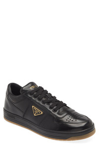 Three different versions of the iconic Prada logo brand this sporty sneaker done in supple leather and finished with a perforated toe for breathability. Lace-up style Removable insole Leather upper and lining/rubber sole Made in Italy Designer Shoes