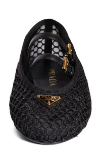 Prada's iconic triangular logo brands this ballet-inspired mary jane made with twin leather top straps from mesh-backed nylon netting. Adjustable straps with buckle closures Textile and leather upper and lining/rubber sole Made in Italy Designer Shoes