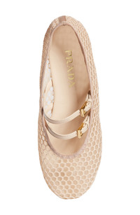 Prada's iconic triangular logo brands this ballet-inspired mary jane made with twin leather top straps from mesh-backed nylon netting. Adjustable straps with buckle closures Textile and leather upper and lining/rubber sole Made in Italy Designer Shoes