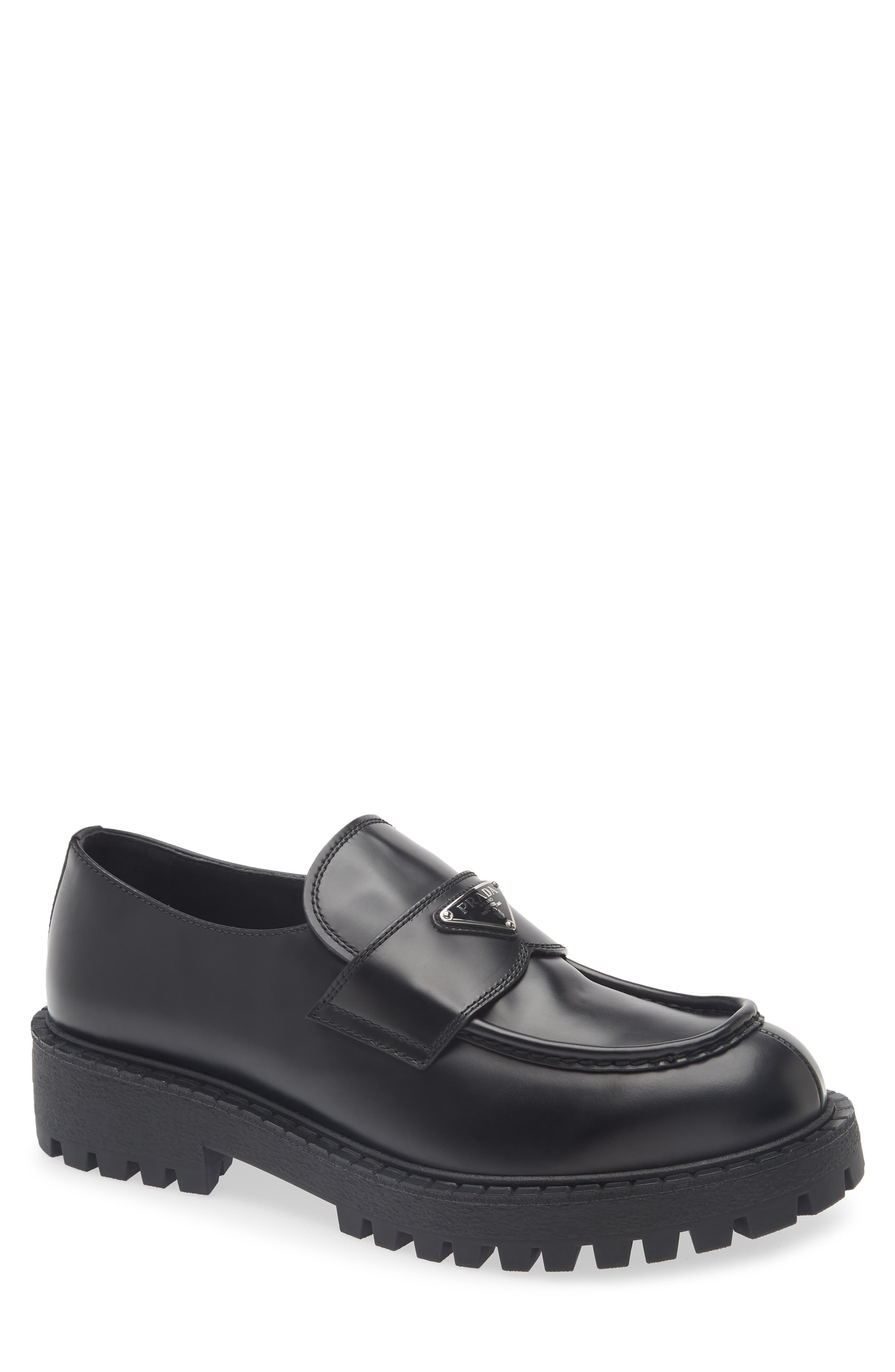 Prada's iconic triangular logo—royally endorsed with the House of Savoy coat of arms—shines against Italian calfskin on this loafer set on a lug sole with a ridged welt that resembles tiny chocolate bars. Leather upper and lining/rubber sole Made in Italy Designer Shoes