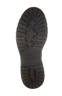 Prada's iconic stamped logo adds a heritage signature to a sleek leather Chelsea boot boldly updated with a tiered platform sole ridged to look like a chocolate bar. Pull-on style with elastic gore insets Leather upper and lining/synthetic sole Made in Italy Designer Shoes